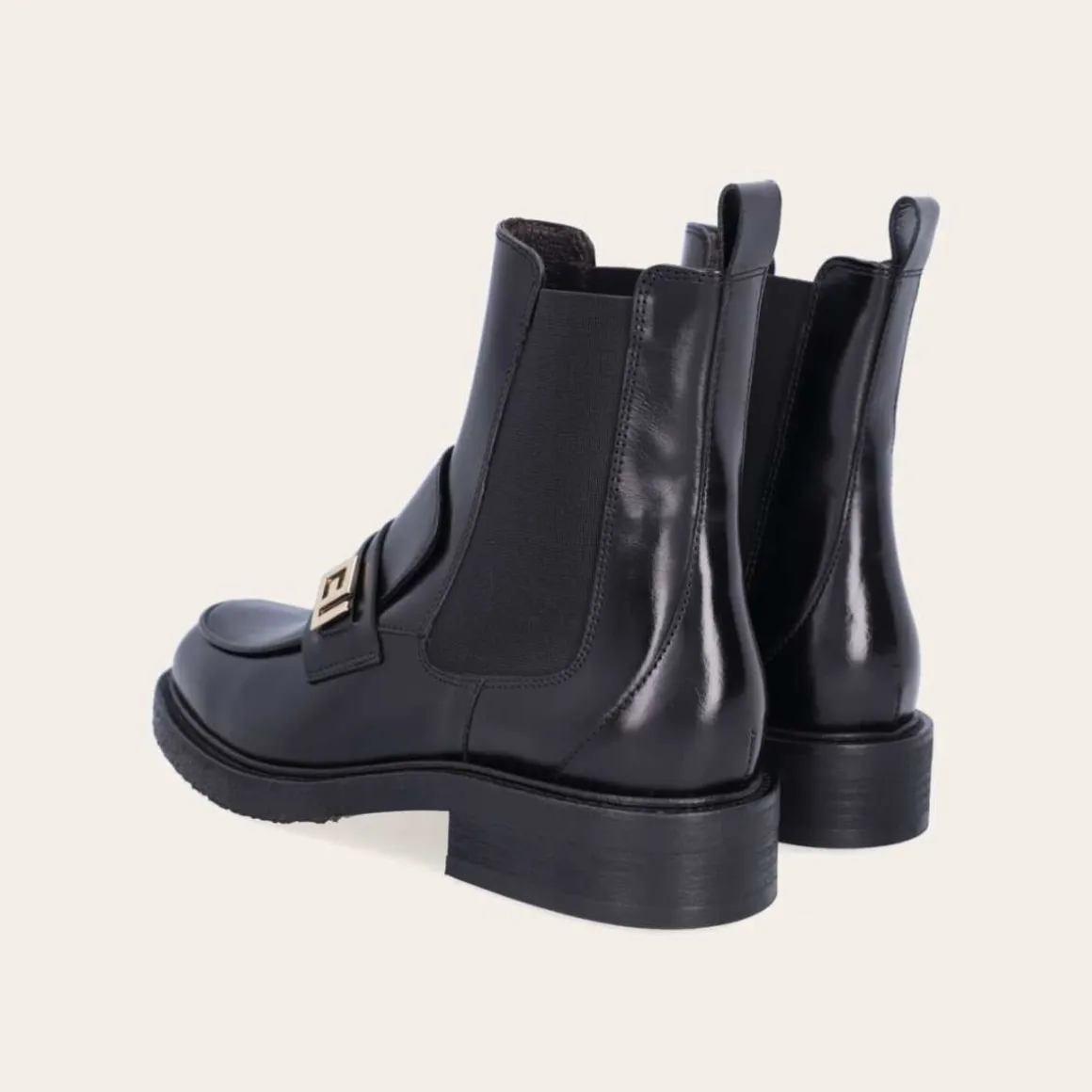 Håndlaget støvel fra Billi Bi, laget av svart glatt skinn med rund tå. Støvelen er dekorert med elastiske sidepaneler og en stropp bak. Støvelen er også dekorert med en gyllen spenne på siden av forfoten.