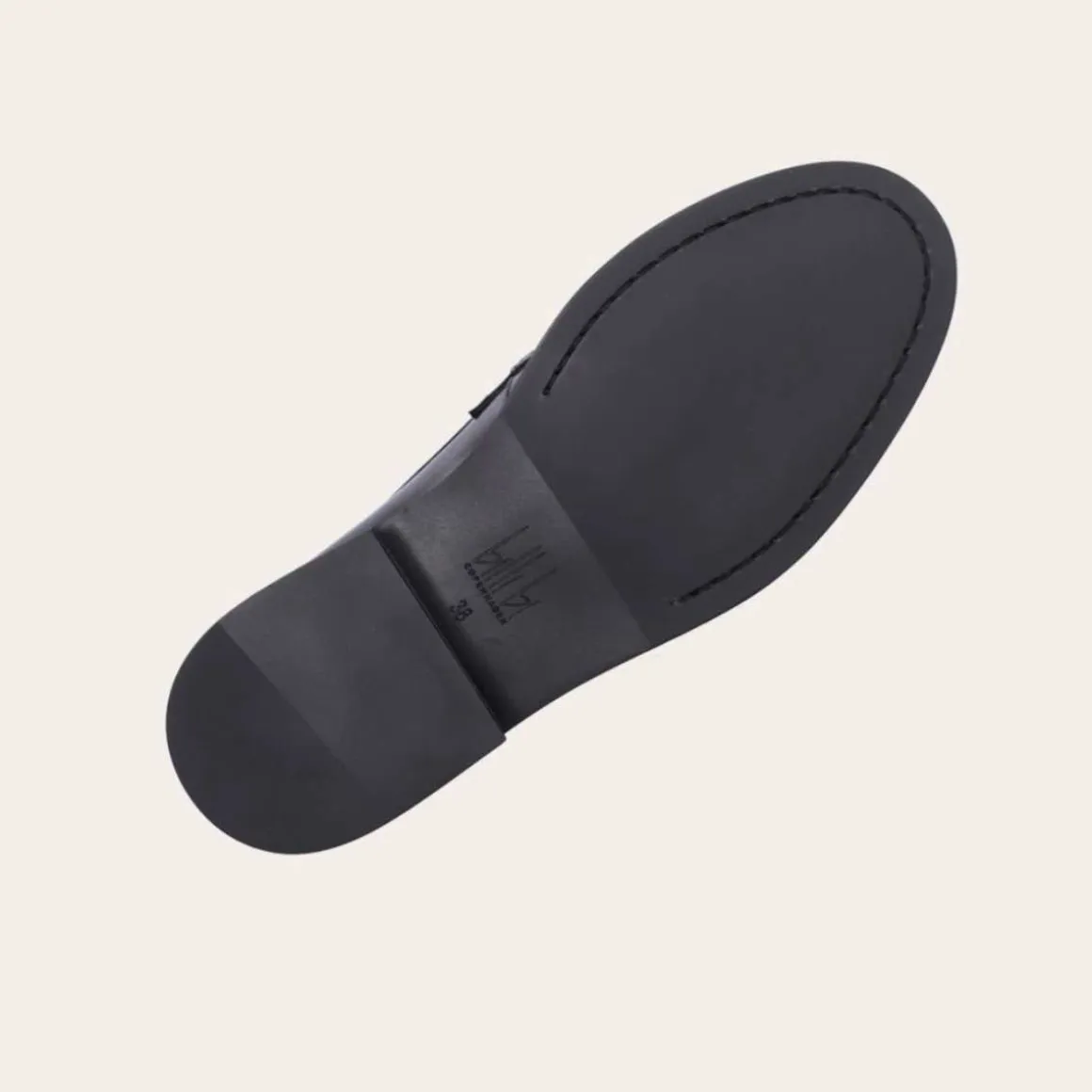 Håndlaget loafer fra Billi Bi, utført i sort glatt skinn med rund tå. Loaferen er dekorert med en skinnrem og et gyllent spenne over forfoten, samt piping foran og bak.