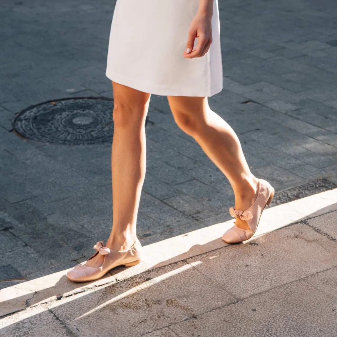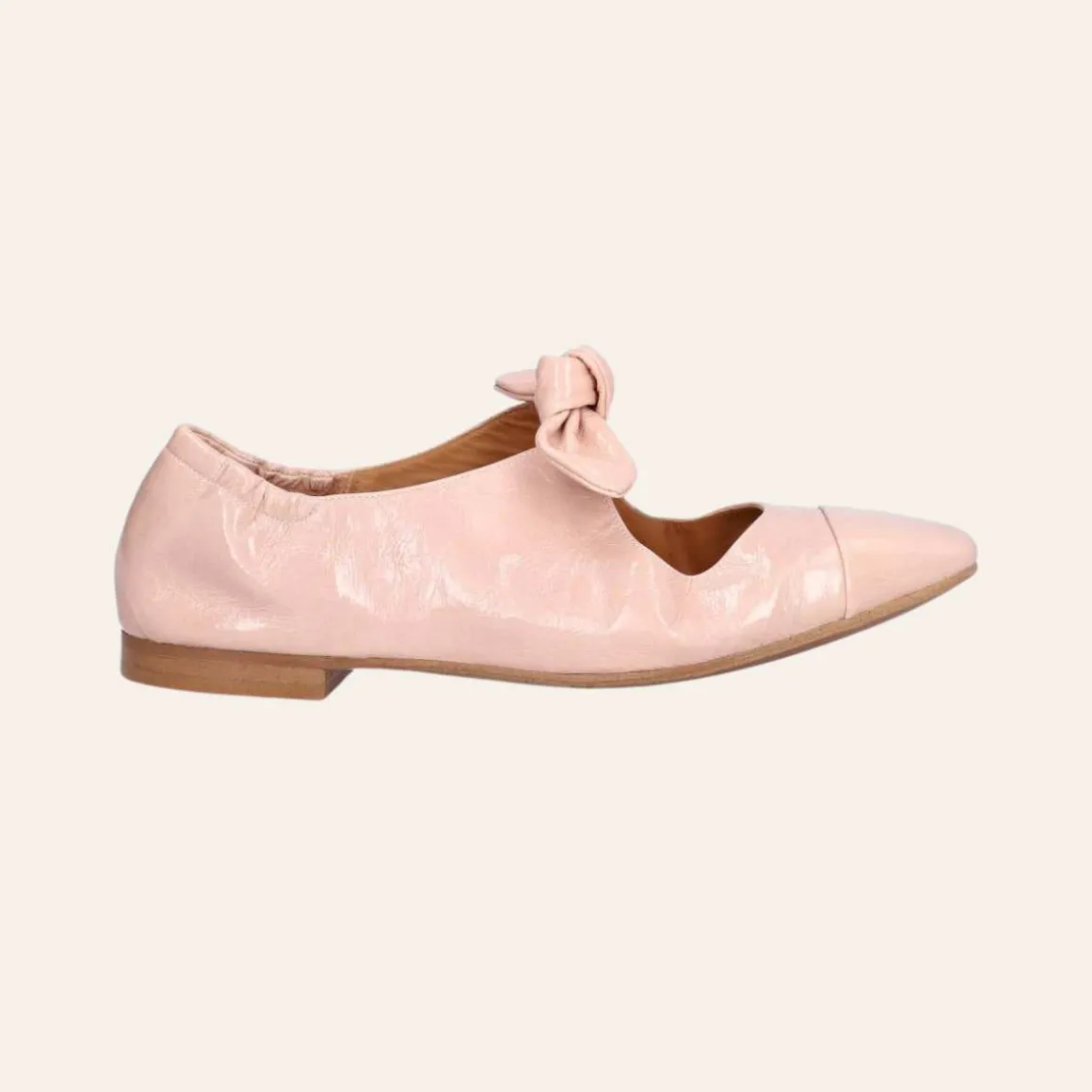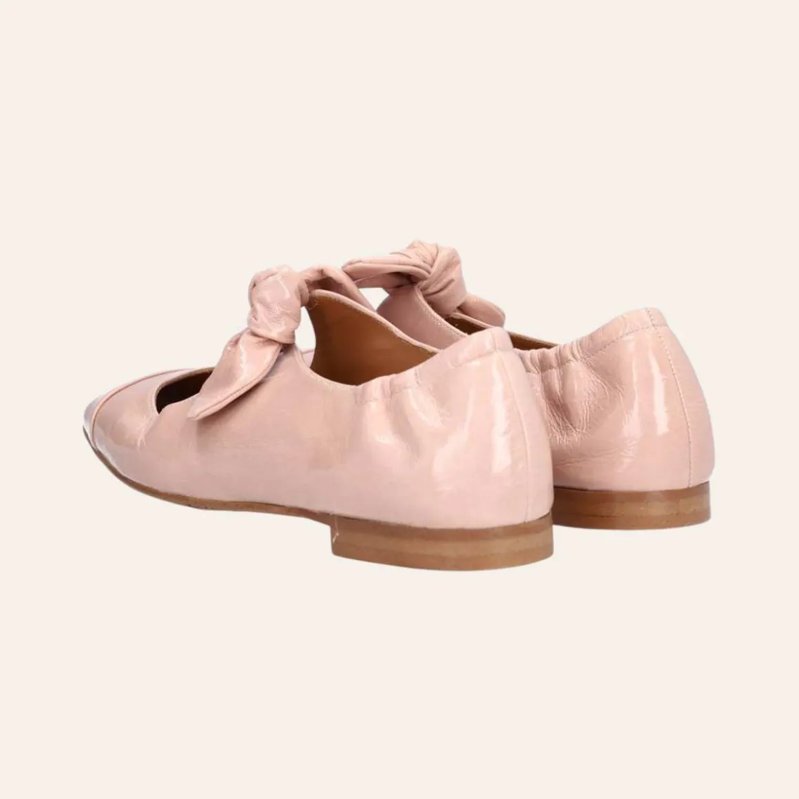 Denne ballerinaen er laget i rosa lakkskinn med firkantet tå. Den har en feminin sløyfedetalj over forfoten og dekorativ søm på tåen, samt en elastisk hælkappe bak for optimal komfort.