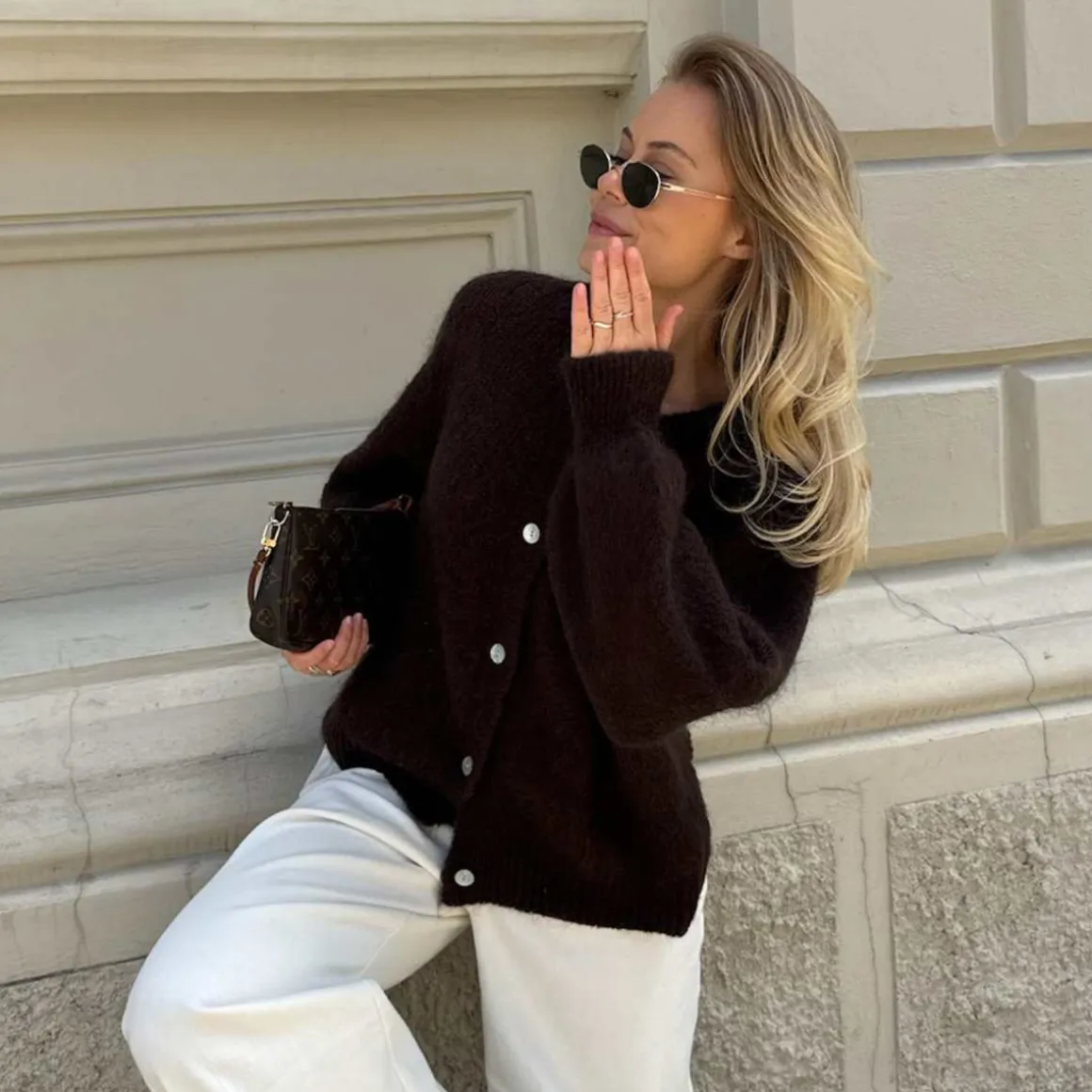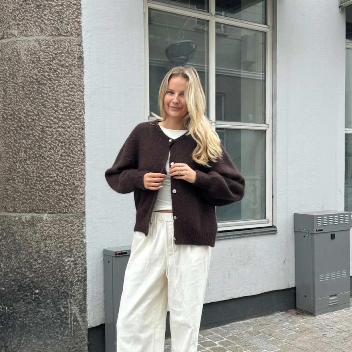 Lurvete mohairkofta med lange, voluminøse ermer, ribbestrikkede detaljer og perlemorslook på knappene.