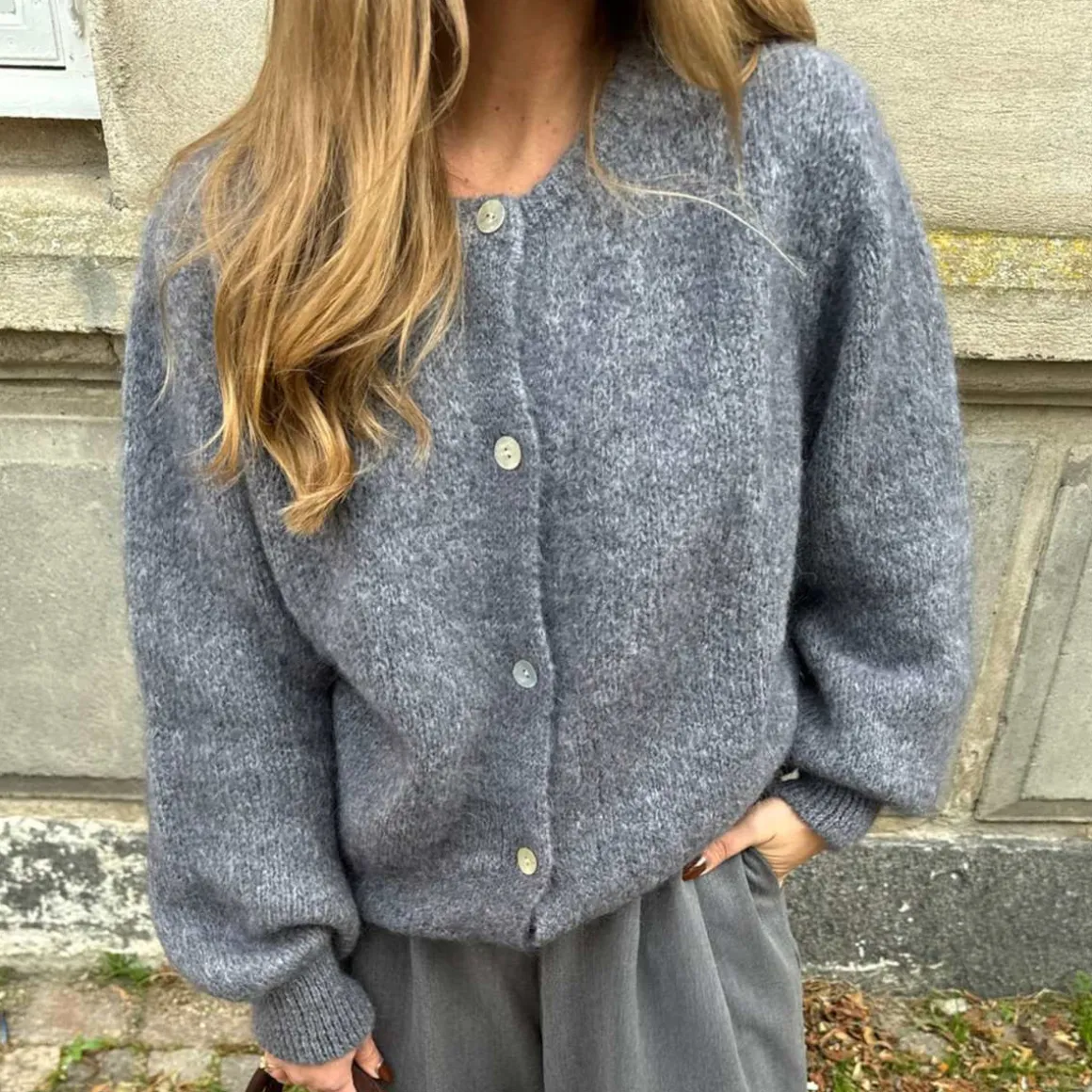 Lurvete mohairkofta med lange, voluminøse ermer, ribbestrikkede detaljer og perlemorslook på knappene.
