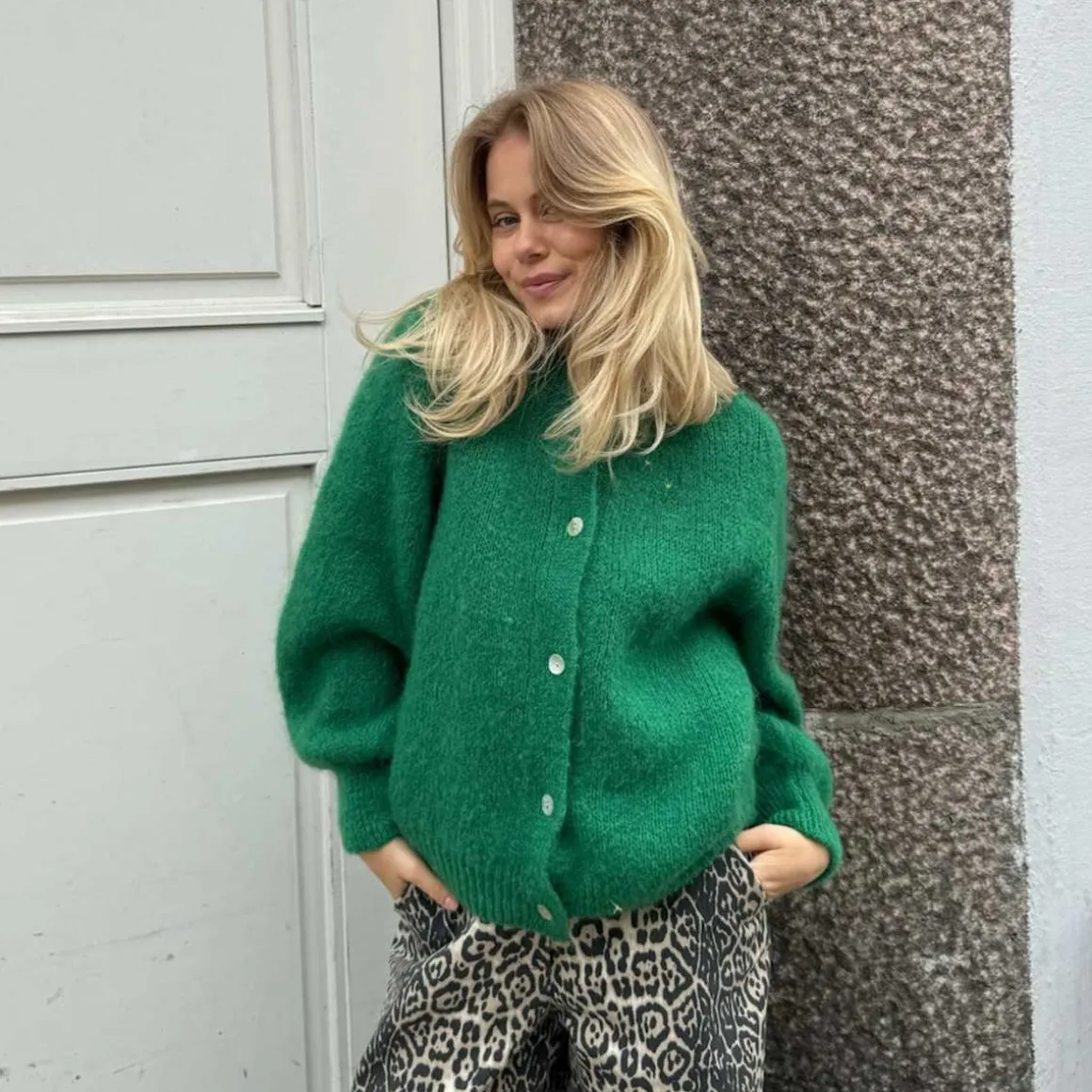 Lurvete mohairkofta med lange, voluminøse ermer, ribbestrikkede detaljer og perlemorslook på knappene.