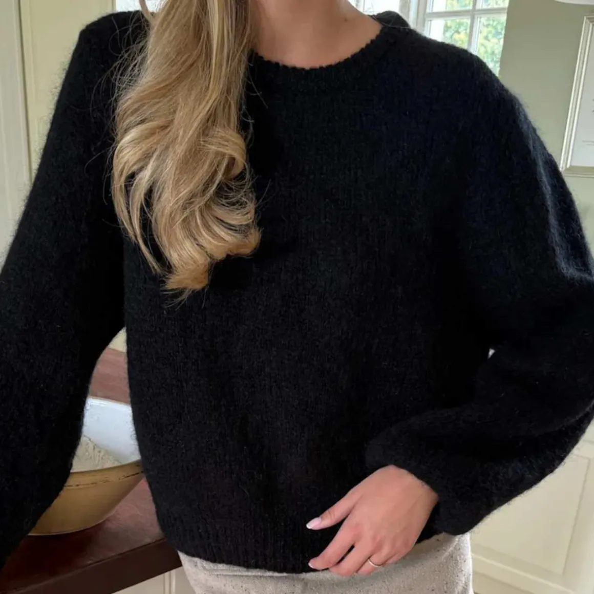 En myk og luksuriøs mohair-genser med lange ermer, lett puffet med smale ribbestrikkede mansjetter. Genseren har rund hals og fine ribbekanter både nederst og rundt halsen, som gir et elegant og raffinert uttrykk.