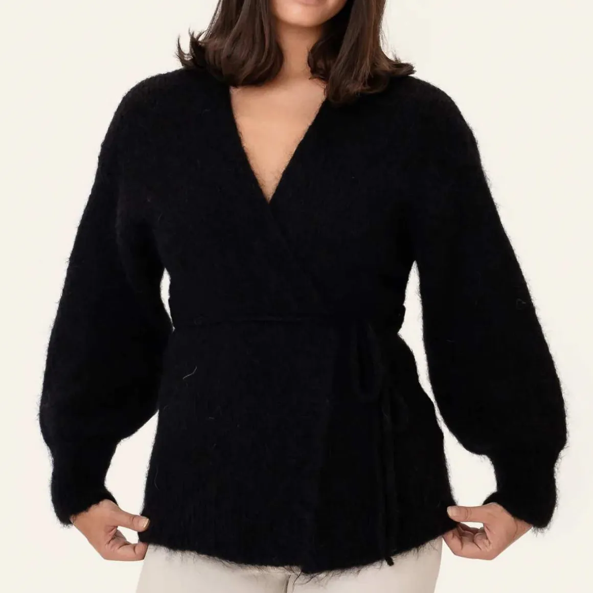 En myk cardigan laget av en luftig ullblanding. Denne stilen er inspirert av BYIC sin populære IdaIC Cardigan, gjenskapt i et elegant omslagsdesign. Den knytes i midjen med et matchende belte, som fremhever figuren og skaper en feminin silhuett. De lange, lett ballongformede ermene og den dype V-halsen gir den et avslappet, men likevel raffinert utseende.
