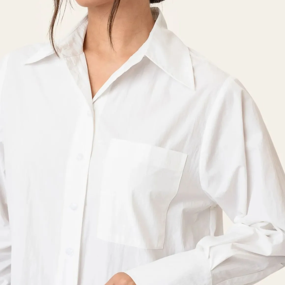 En tidløs hvit skjorte laget av et skarpt materiale med en subtil teksturert overflate. Designet i en avslappet, oversized passform, har den en klassisk krage, knappelukking foran og en enkelt brystlomme for et uanstrengt, men raffinert utseende. Brede mansjetter og rene linjer gjør den til et allsidig must-have i garderoben – ideell for hverdagsbruk eller et elegant kontorantrekk.