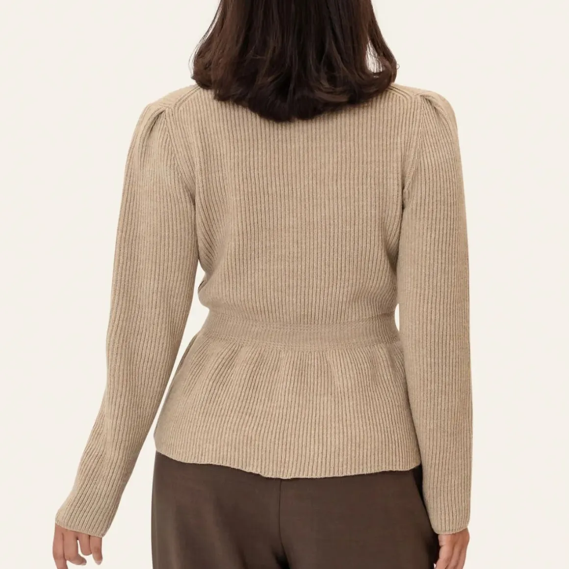 En feminin og elegant strikkebluse med en flatterende peplum-silhuett. Designet er tettsittende i midjen med en myk, utsvingt kant som fremhever formen. Den ribbestrikkede teksturen gir en tidløs og sofistikert følelse.