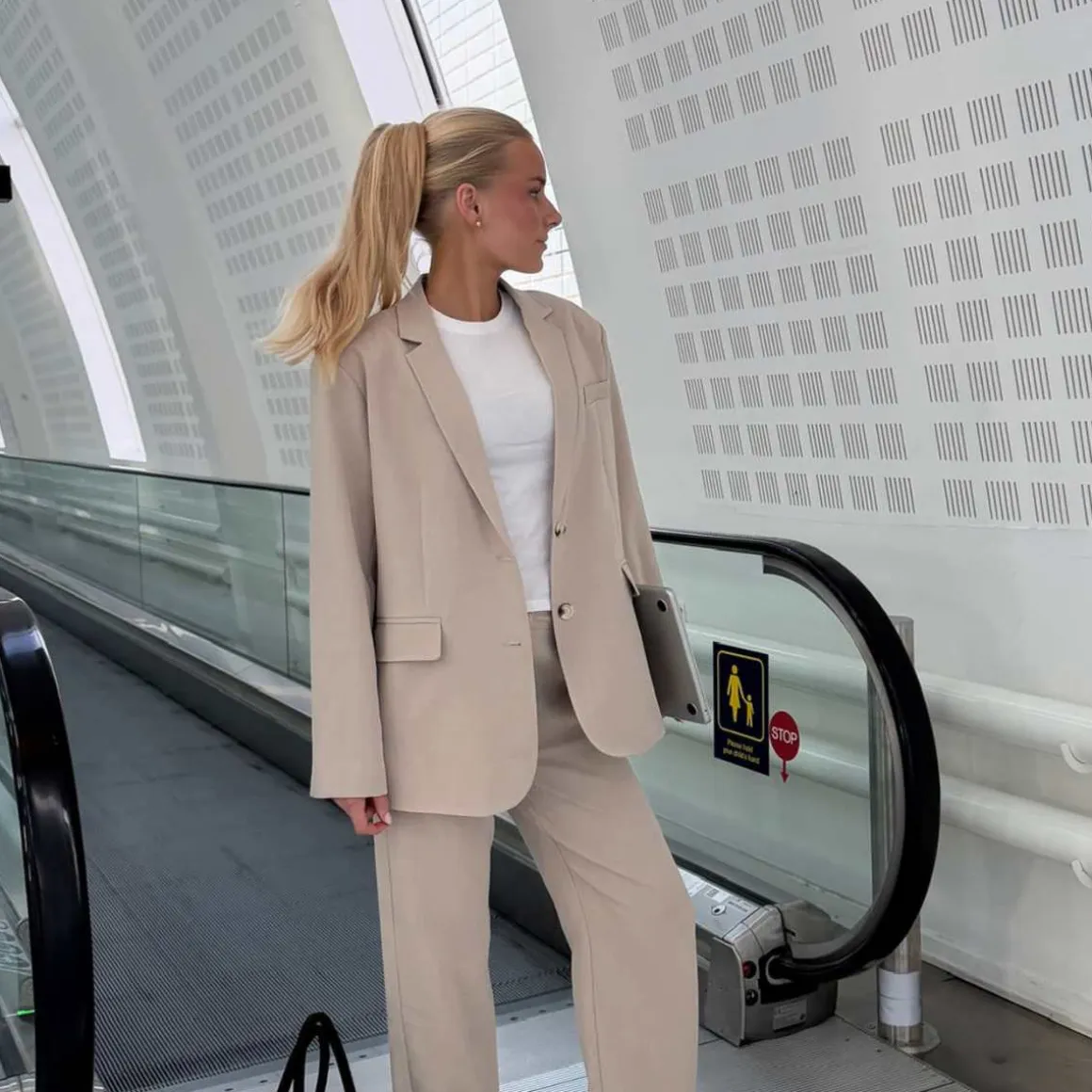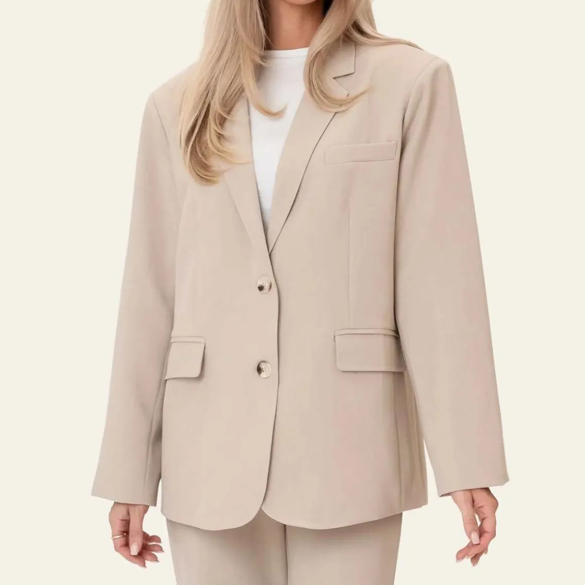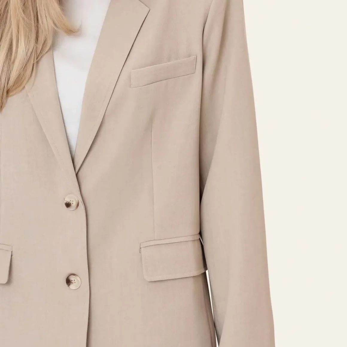 En klassisk og tidløs blazer laget av et lett, strukturert stoff med et elegant fall. Designet med skulderputer for en definert, sofistikert silhuett og en litt overdimensjonert passform. Den har lukking med to knapper, mansjetter med knapper og lommer med klaff for en skreddersydd finish. Kombiner den med matchende bukser for et moderne, polert dressutseende.