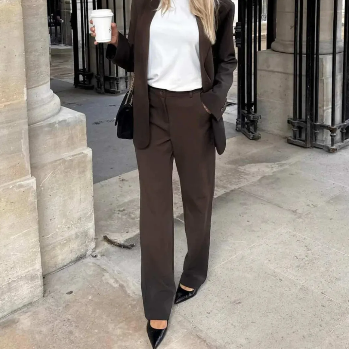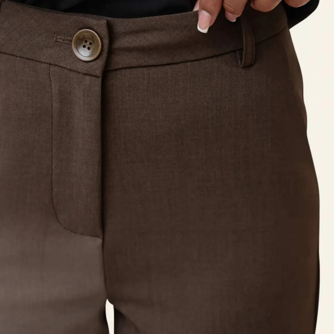 Et par klassiske mørkebrune bukser fra BYIC med et tidløst og allsidig design. De har en rett, litt vid passform og er laget av et mykt og komfortabelt stoff med et hint av stretch for uanstrengt bevegelsesfrihet. De er designet med beltehemper, sidelommer og to fuskelommer bak for en ren og polert finish. Den minimalistiske silhuetten gjør dem perfekte for både hverdagsbruk og mer formelle anledninger. Kombiner med en hvit t-skjorte for et avslappet antrekk, eller kombiner med en blazer for et sofistikert kontorantrekk.