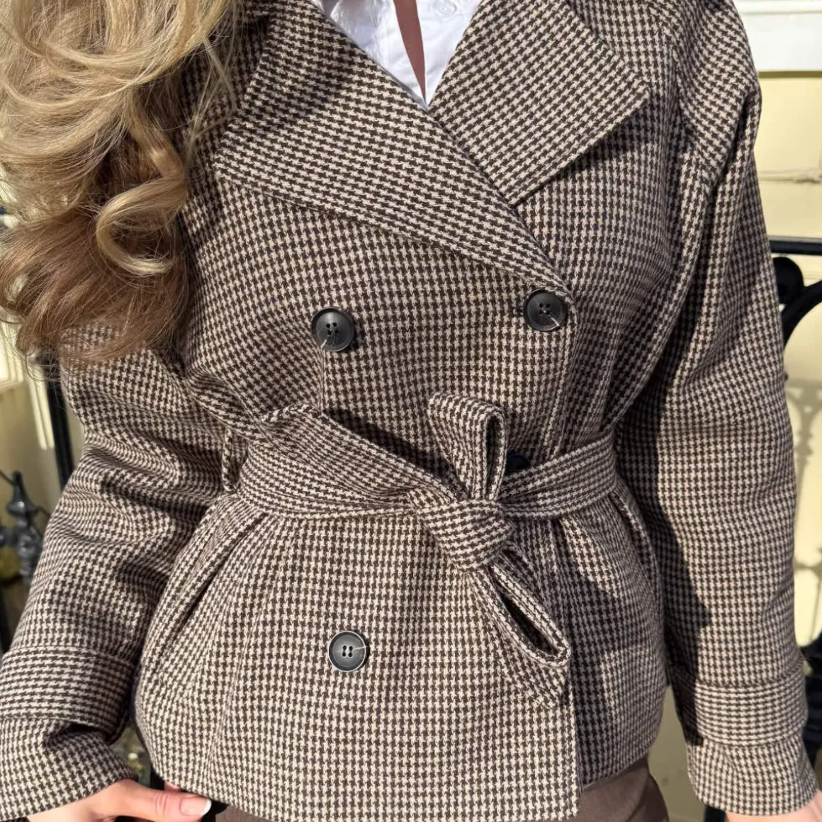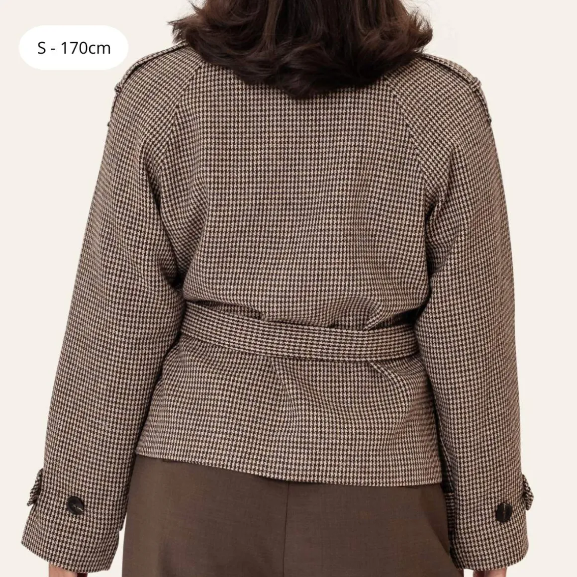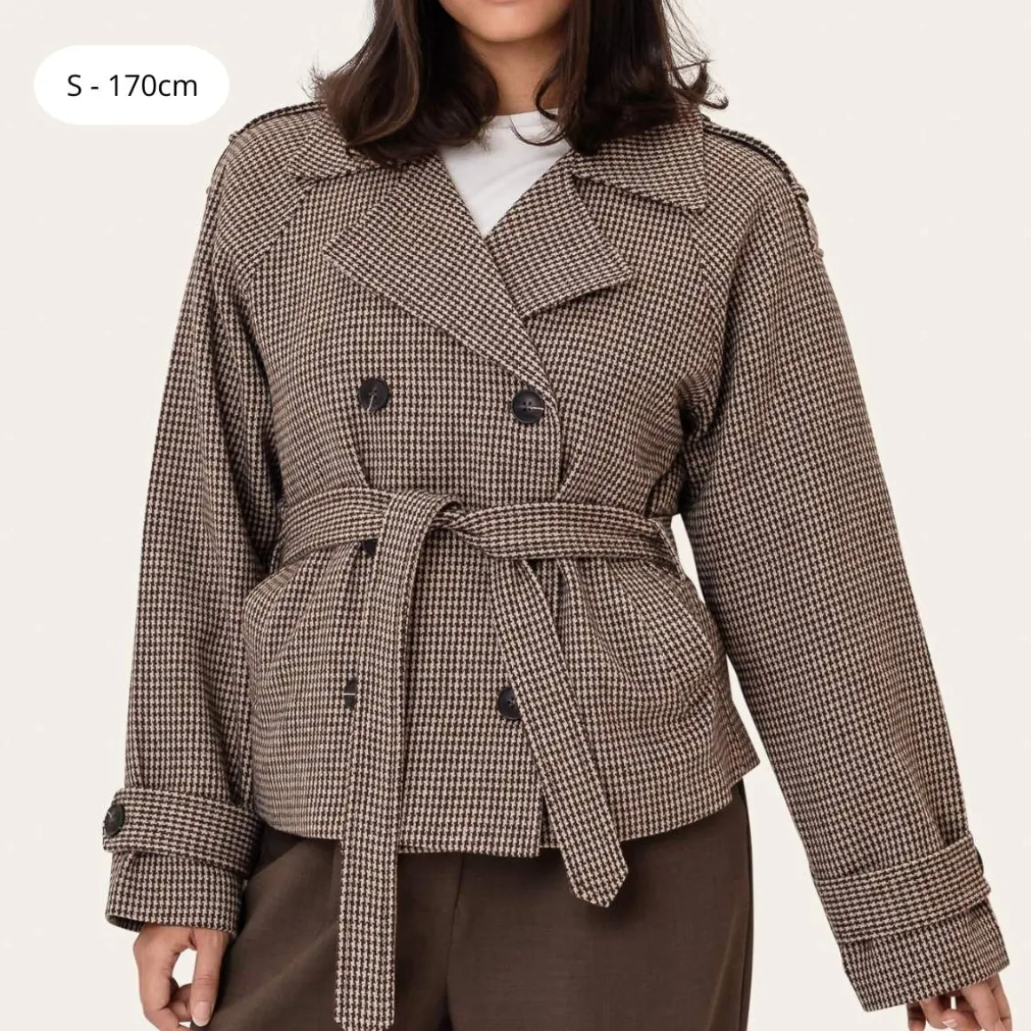 Elegant kort trenchjakke med en tidløs silhuett. Designet har dobbeltspent front, knytebelte i midjen og knappede mansjettdetaljer for et raffinert utseende. Strukturerte skuldre og rene linjer gir et feminint og sofistikert preg, mens den korte lengden gjør den ideell for overgangssesongene. Laget av et brunrutete stoff.