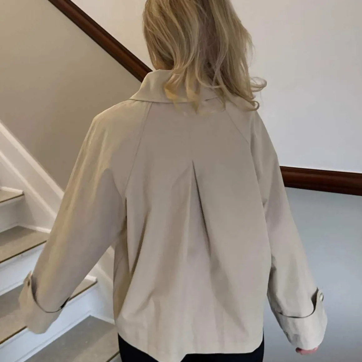 Elegant mørkebrun trenchcoat med løs passform i kroppen og i ermene. Trenchcoaten har en krage som også kan brettes opp med en knapp foran, noe som gir jakken en høy hals. Den har store naturfargede knapper nedover fronten for lukking og stroppedetaljer på ermene, som også festes med en stor naturfarget knapp. Trenchcoaten har leggdetaljer på baksiden, noe som gir jakken et elegant utseende.