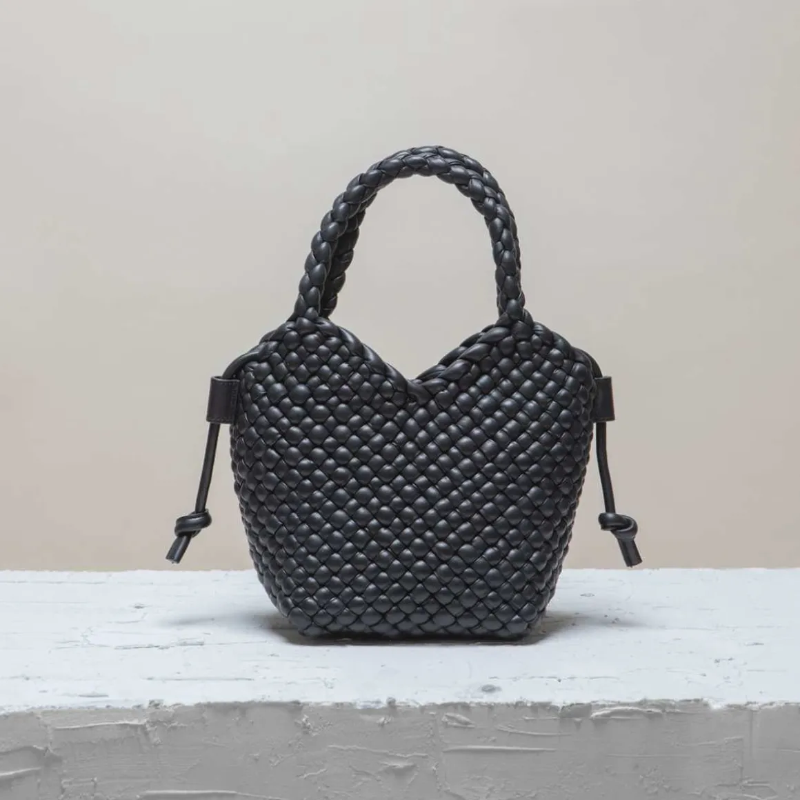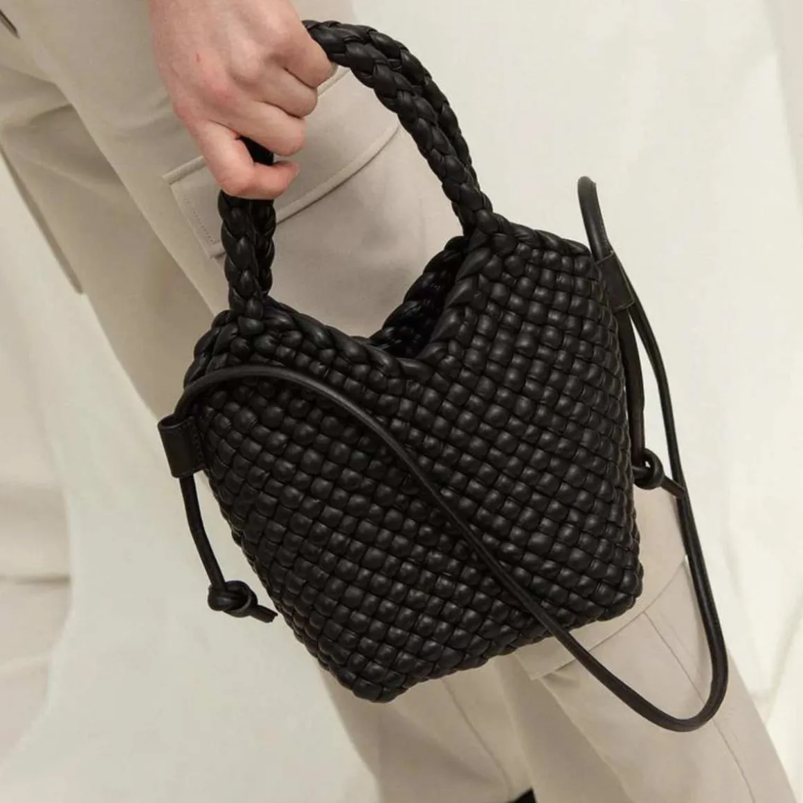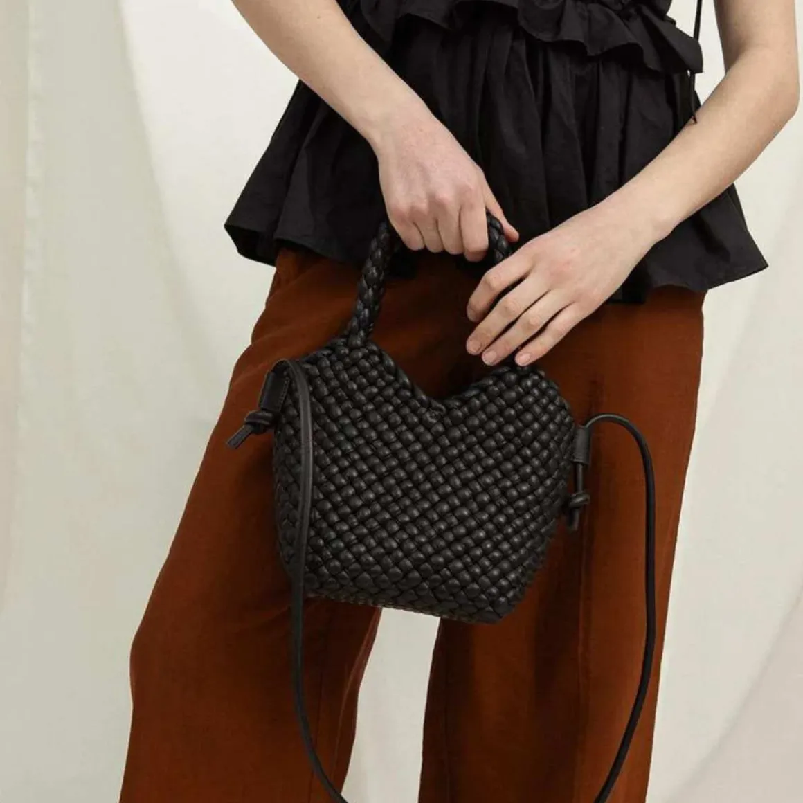 Maya fra Cala Jade. En myk cross-body-veske vevd i rørformede lærstrenger med justerbar skulderreim og avtakbar innerveske.