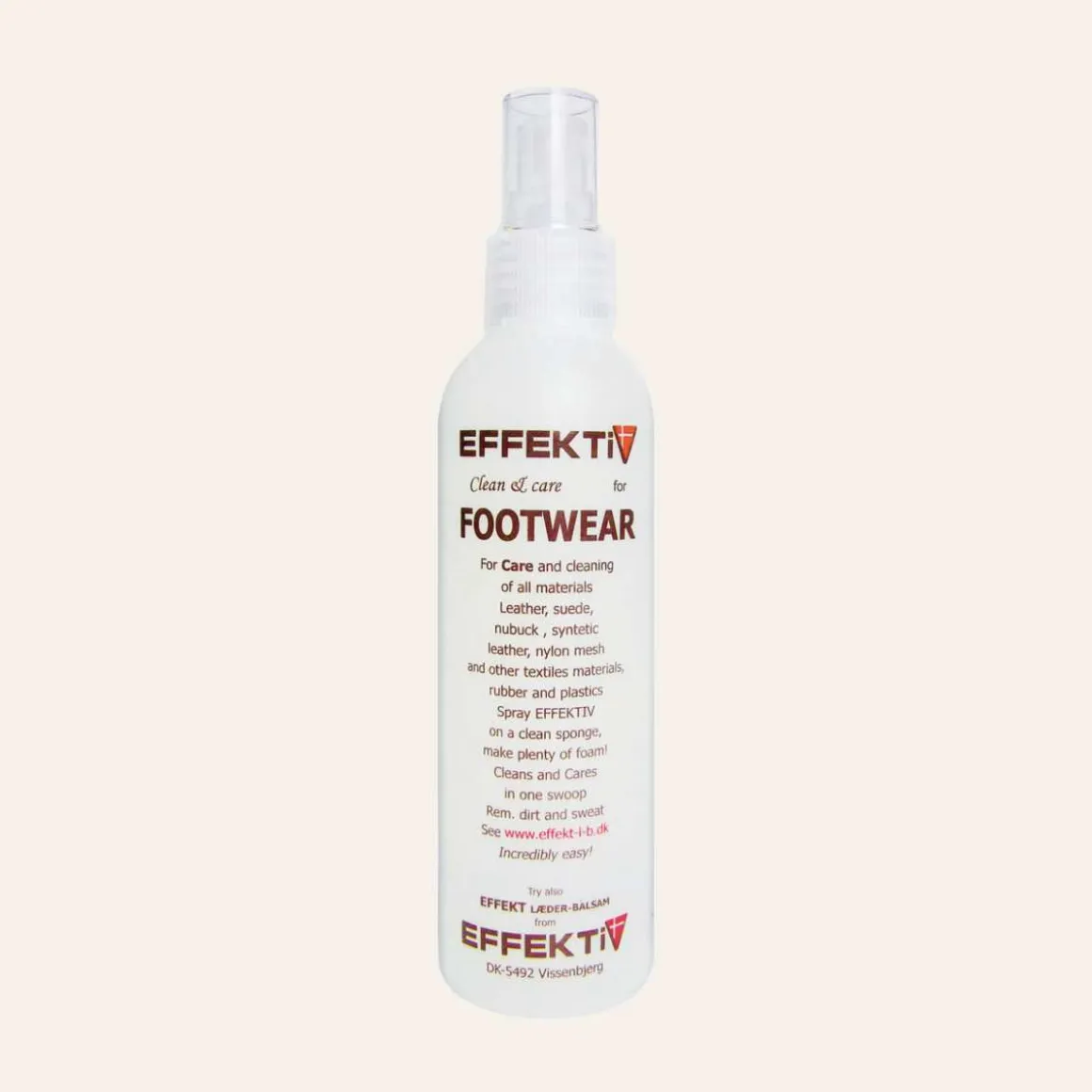 Sko rens til alle materialer. Sprayes på en ren svamp og skummes opp. Pleier og vasker på én gang. Pumpespray med svamp.