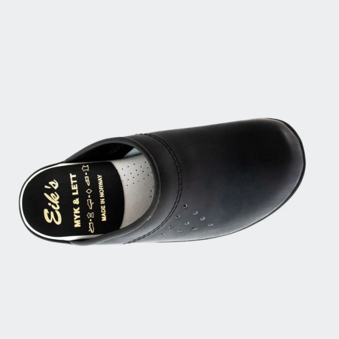 Klassisk Eik´s klogg i svart skinn. Eik Treskofabrikk er en liten familiebedrift som har produsert tresko for det kommersielle markedet siden 1989. Eik´s er en tradisjonsrik norsk skofabrikk som leverer god kvalitet til en god pris. Det er ikke mange norske skofabrikker igjen så ved å kjøpe Eik`s klogger støtter du en norsk familiebedrift.