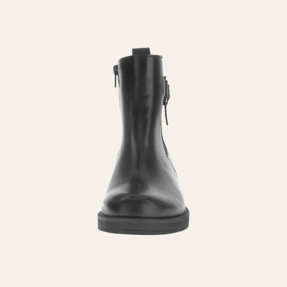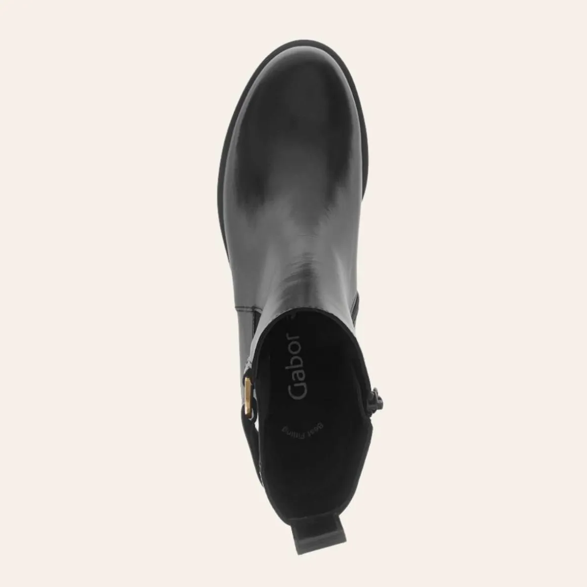 Elegant svart ankelboot fra Gabor. Laget i glatt skinn med rund tå og blokkhæl på 3,5 cm. Modellen har mykt mikrofiberfôr, uttagbar innersåle og Gabor Best Fitting-teknologi for ekstra komfort. Med en skaft-høyde på 16 cm kombinerer denne støvletten stil og funksjonalitet – perfekt til både hverdag og fest.