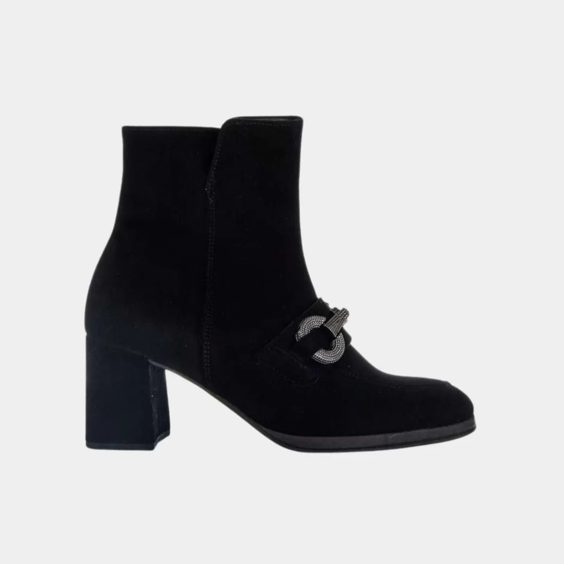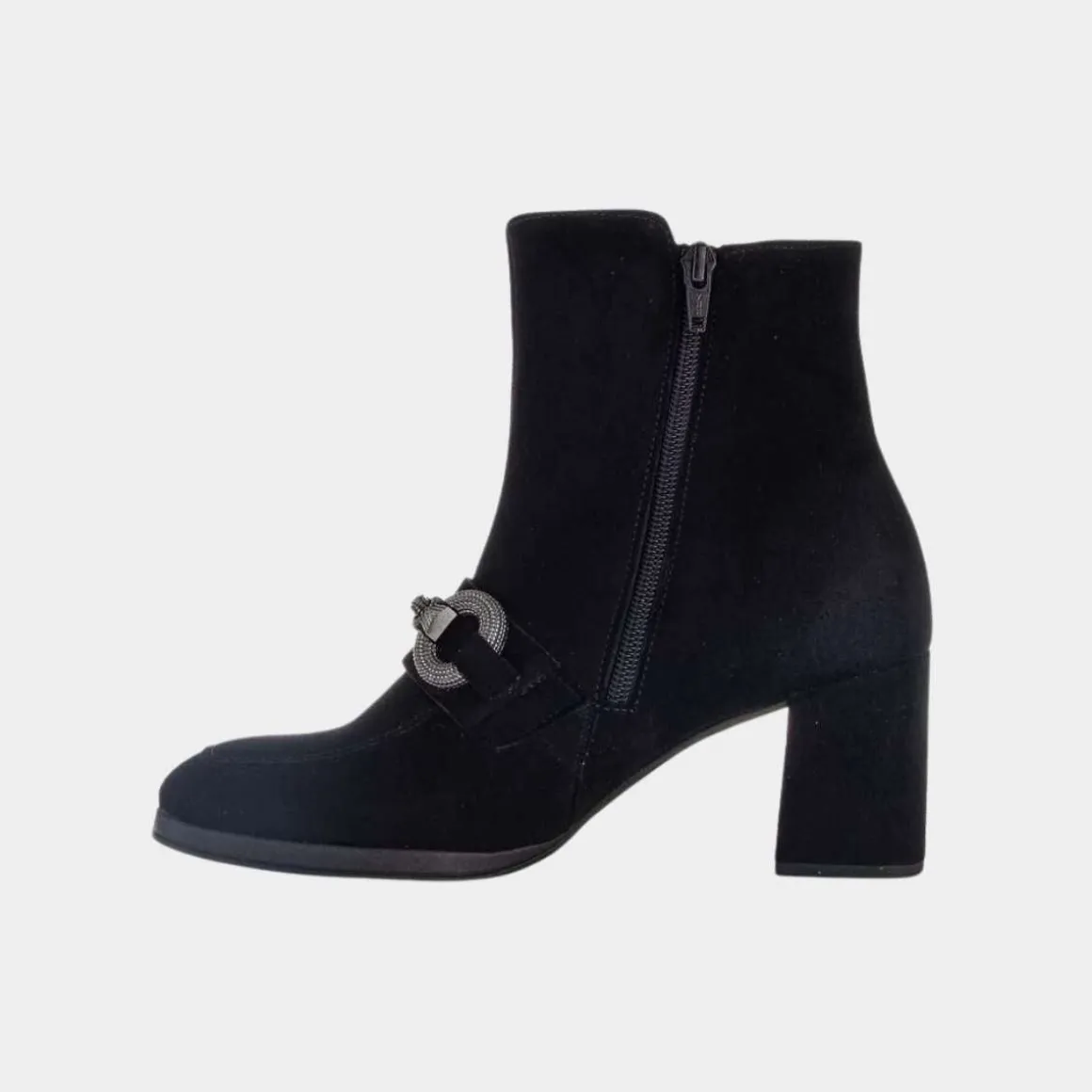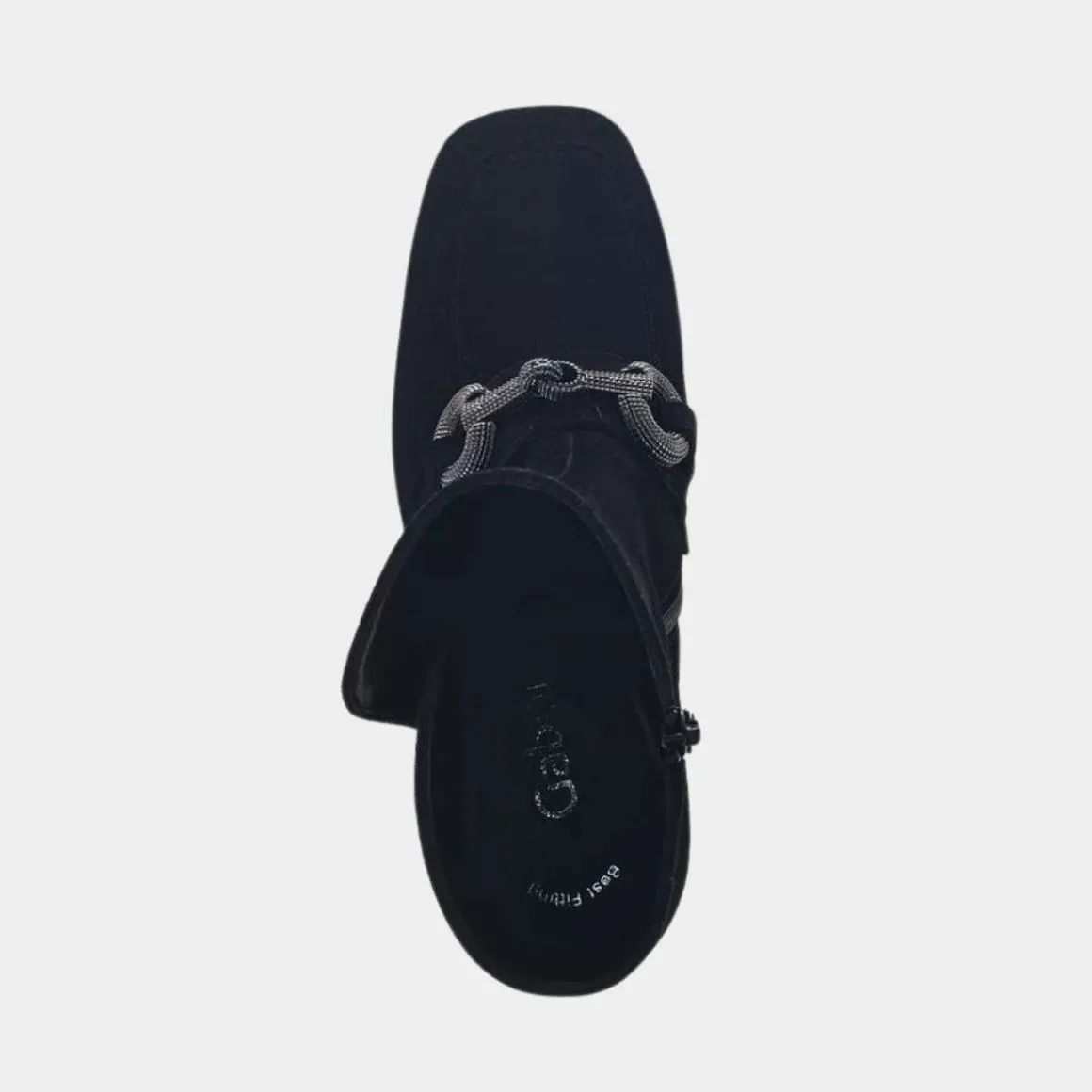 Elegant støvlett fra Gabor. Med Gabor trenger ikke komfort gå på bekostning av utseende. De er like bra ut som de er å gå på. Stabil blokkhæl på 6.5cm og semsket skinn for en ekstra fin look på skoen. Pyntet glam på fremsiden for det lille ekstra.