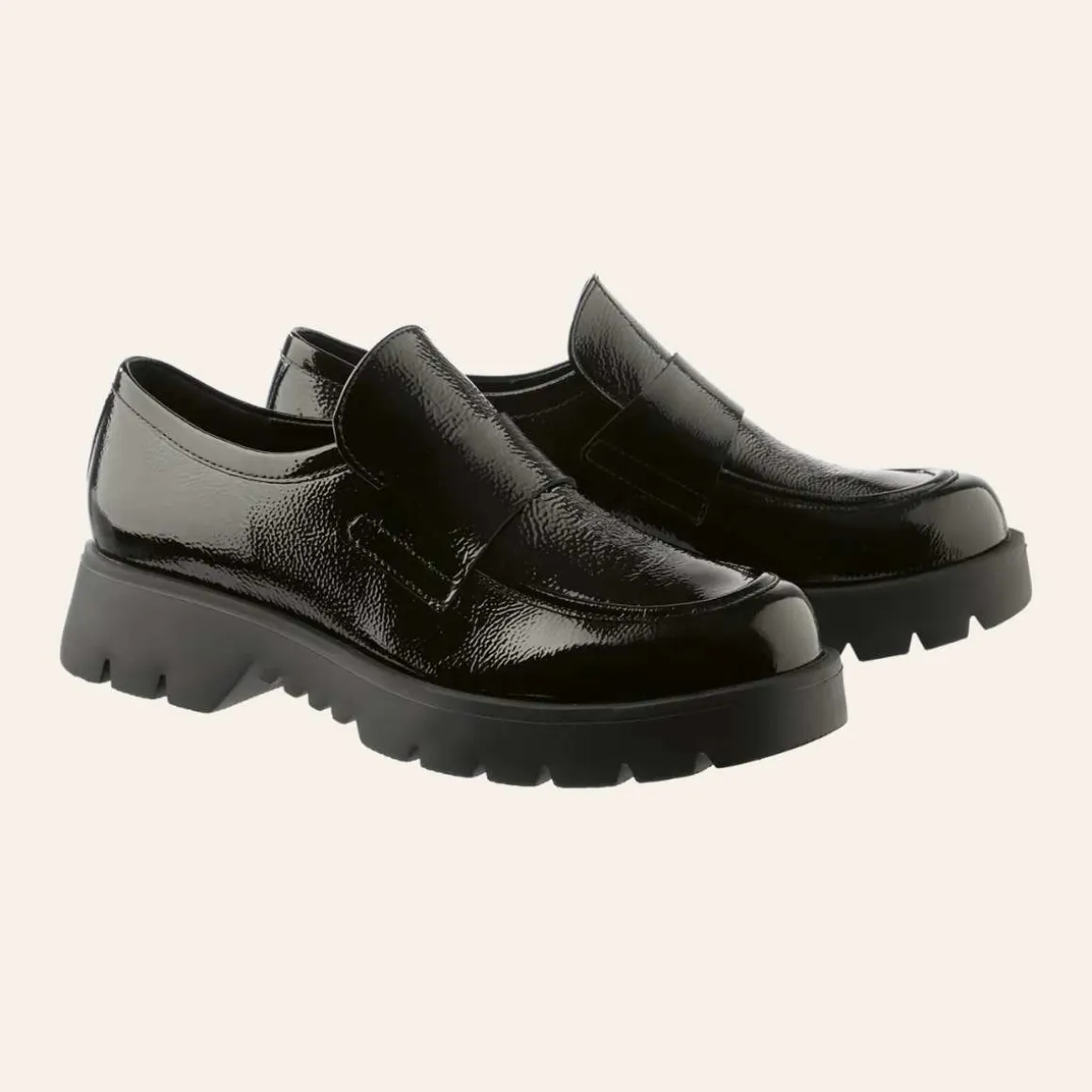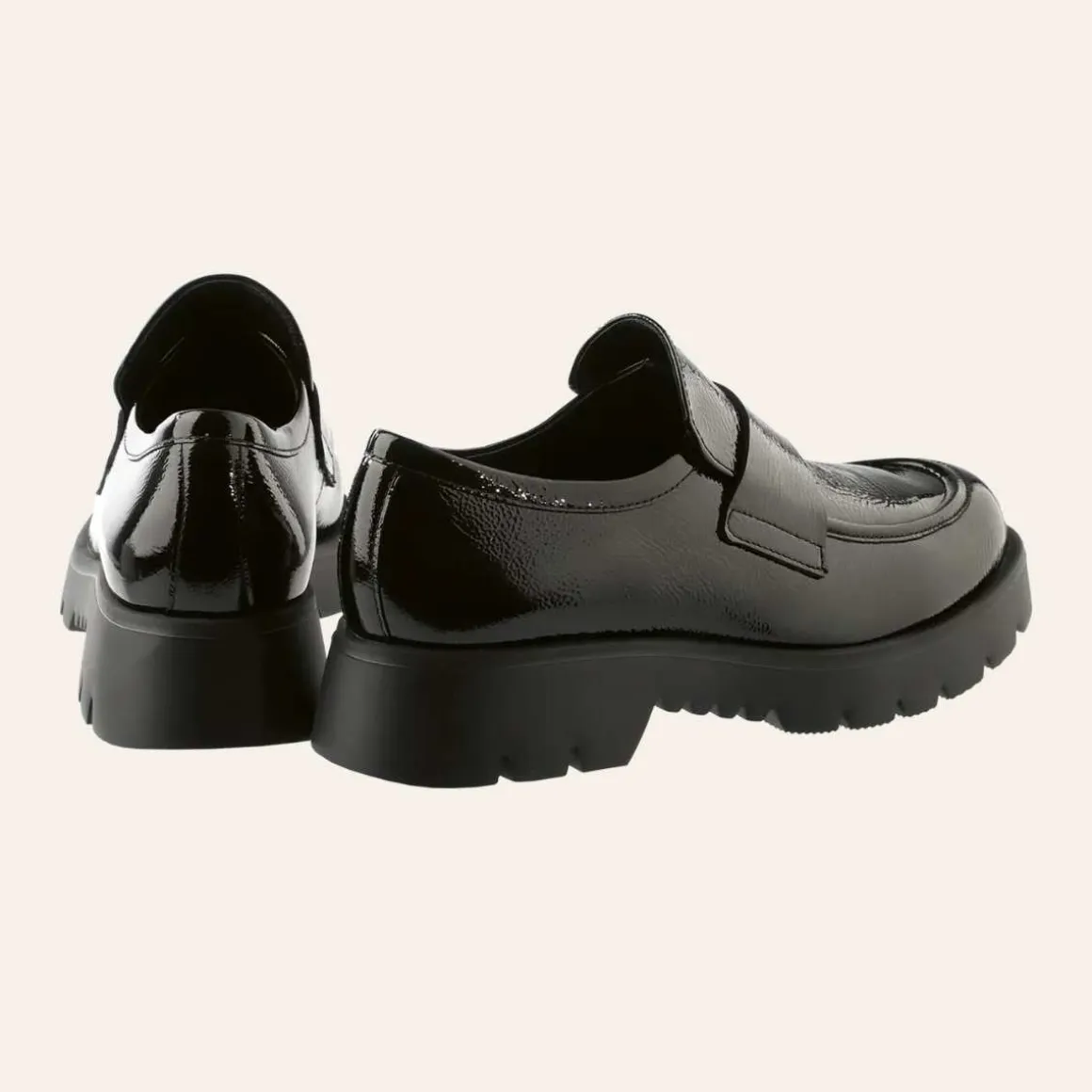 Den minimalistiske silhuetten til Høgl sine svarte loafers «Finn» kombinerer materialer av høy kvalitet med fantastisk komfort – og sko laget i Europa. Disse myke Högl-loafersene er laget av et blankt skinn med lett krøllet effekt som gir et subtilt, men markant uttrykk. De kraftige, mønstrede og sklisikre yttersålene fullfører designet.