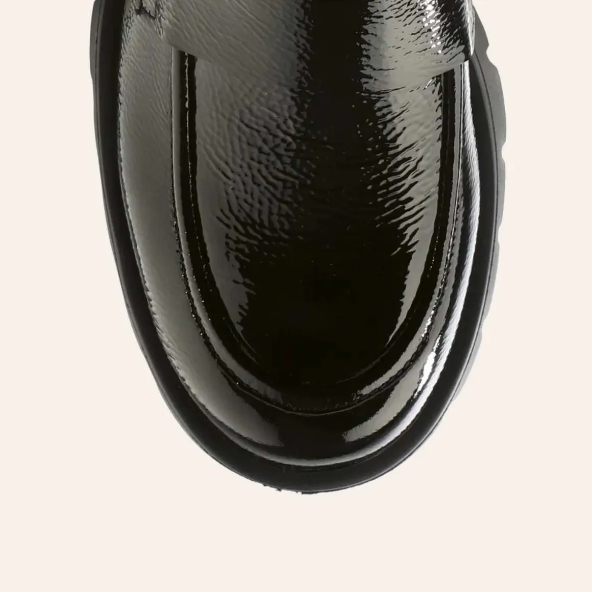 - Overmateriale: Mykt lammelær med lakkskinn-finish, høyglans med krølleeffekt