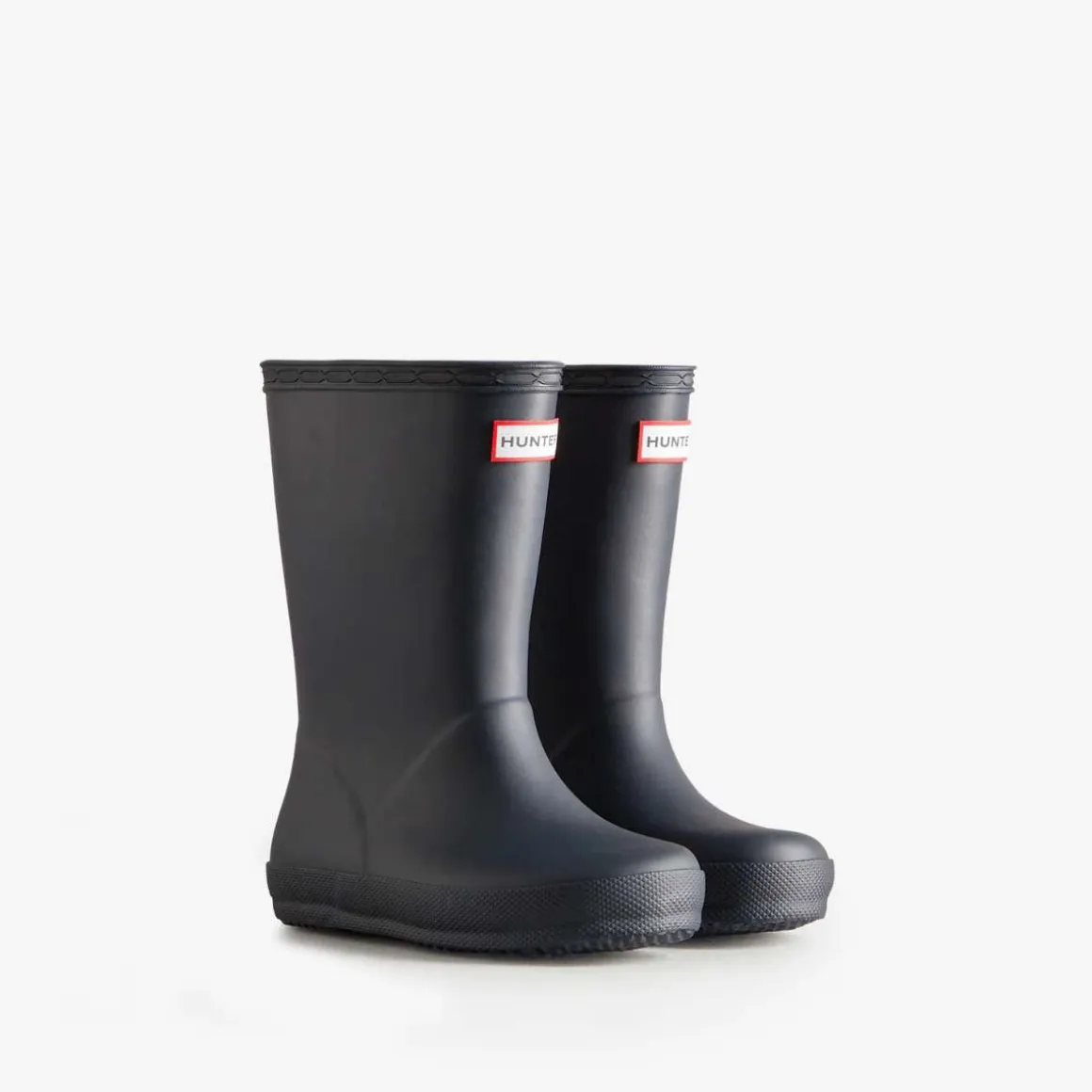 Hunter Kids First Classic Rain Boot er perfekt for plaskelek i sølepytter. Håndlaget av naturlig gummi, med en flat såle og rund tå som gir små føtter plass til å bevege seg. Det oppdaterte fôret i 100% resirkulert polyester sikrer full komfort for hvert eventyr. Disse marineblå støvlene for barn er helt vanntette og har et spesialutviklet mønster i sålen for å redusere sklifare.