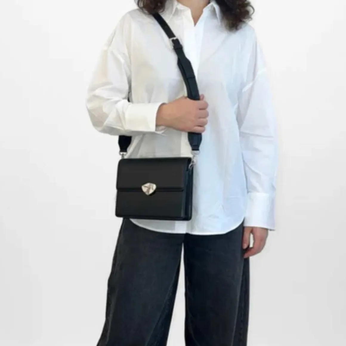 Crossbody-veske fra HVISK med magnetlukking og justerbar stropp. Vesken har en utvendig frontlomme og ett stort hovedrom med en innerlomme.