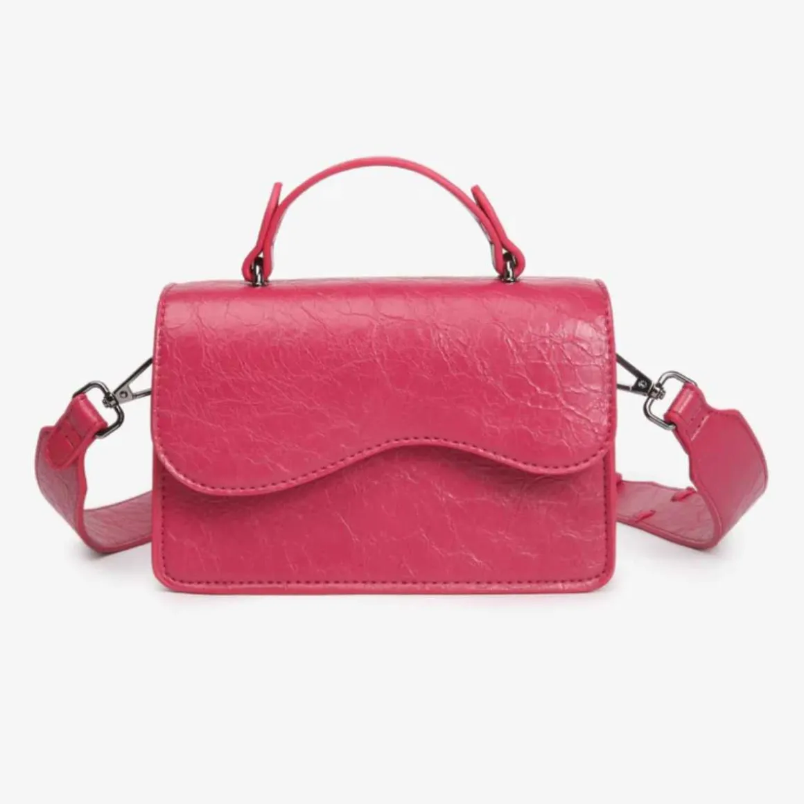 Miniveske med bølgete designdetaljer. Vesken har magnetisk lukking og inneholder ett rom med en innvendig glidelåslomme. Vesken har et kort håndtak og en justerbar skulderrem.