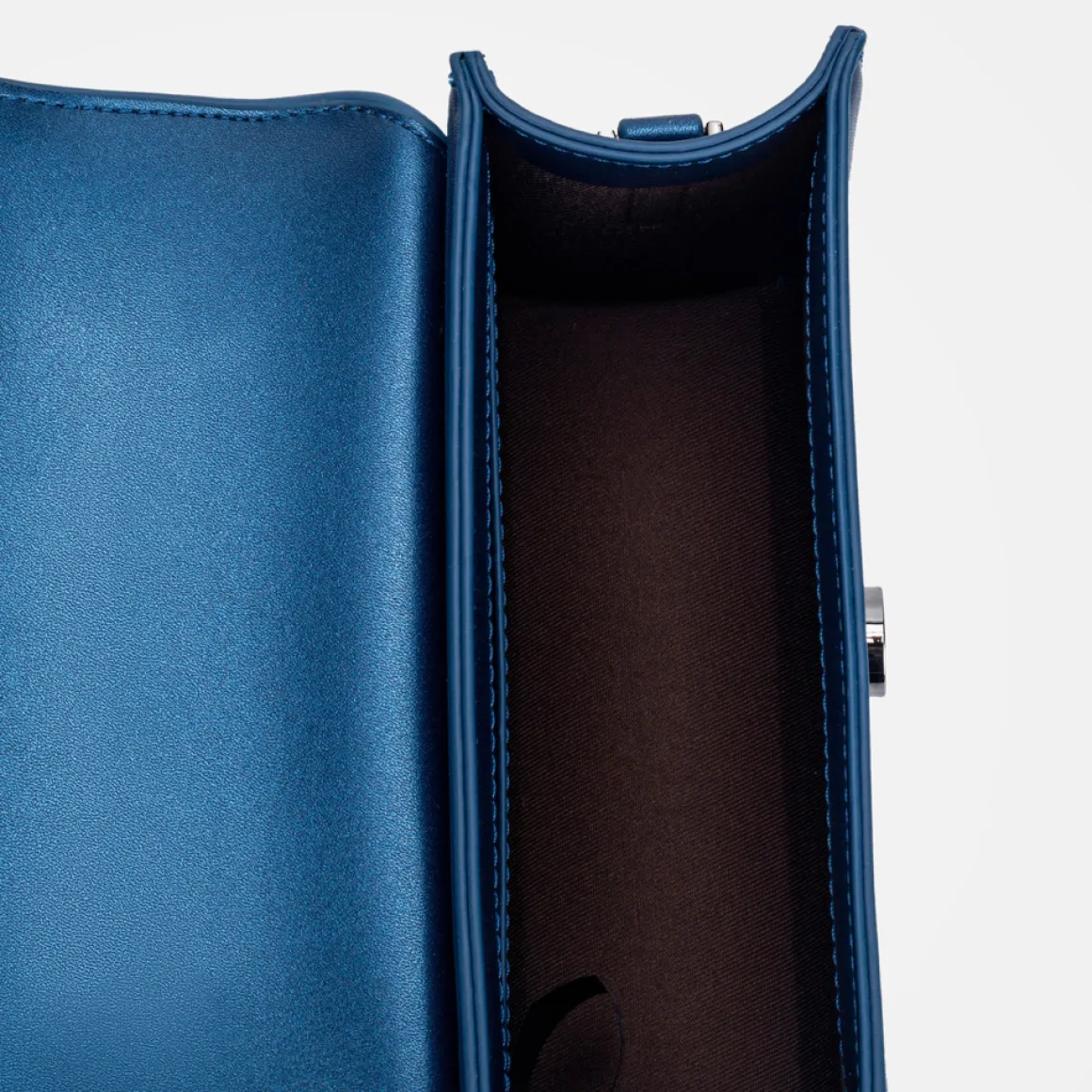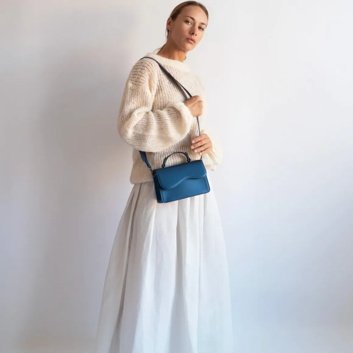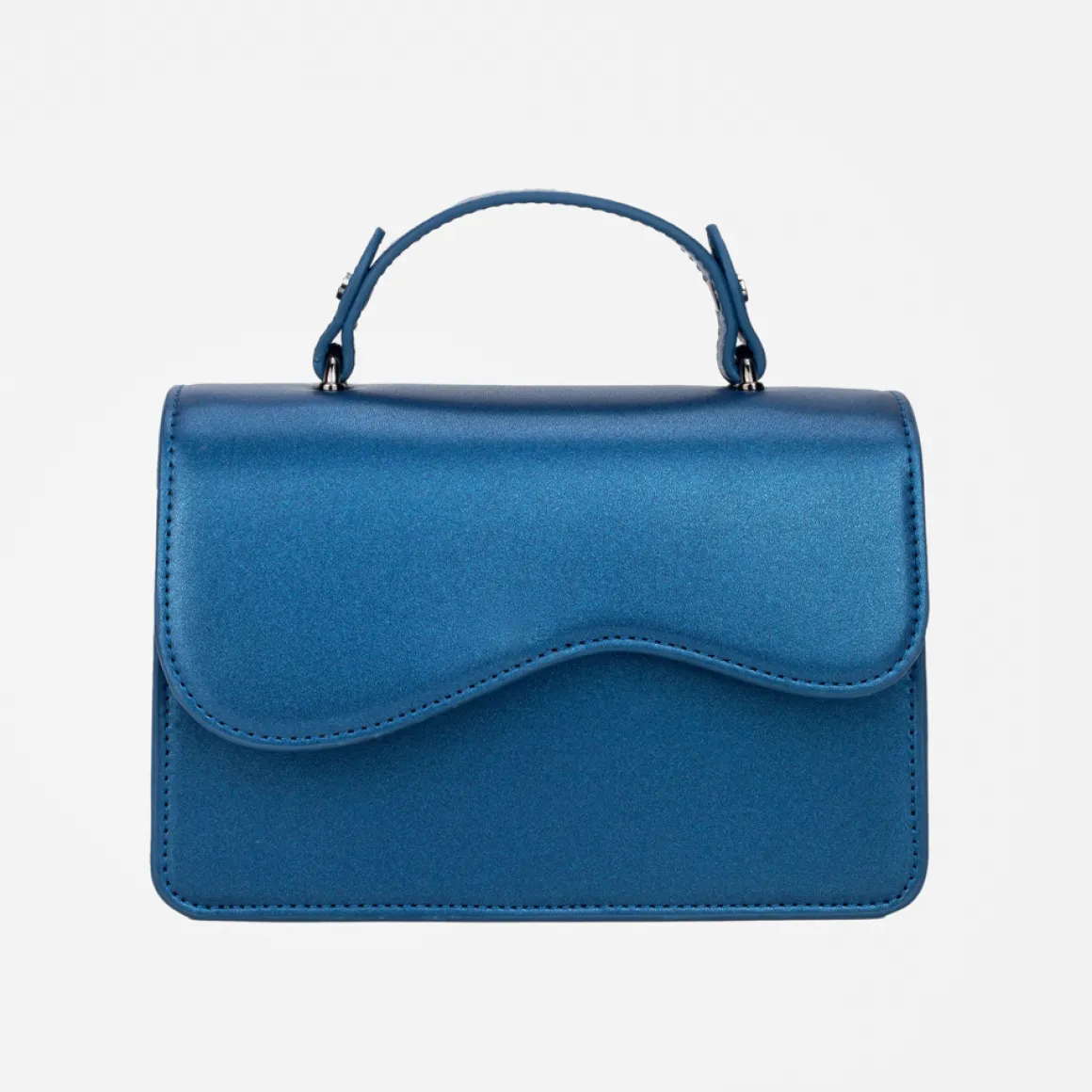 Miniveske med bølgede designdetaljer. Vesken har magnetisk lukking og ett rom med en innvendig glidelåslomme. Den har et kort håndtak og en justerbar crossbody-stropp.