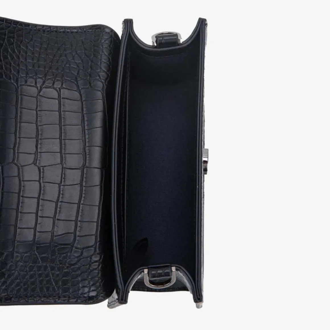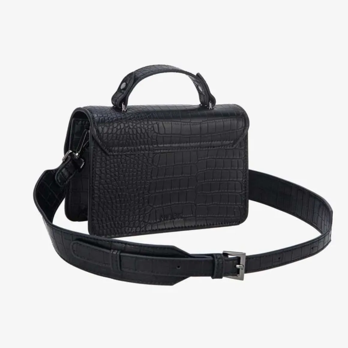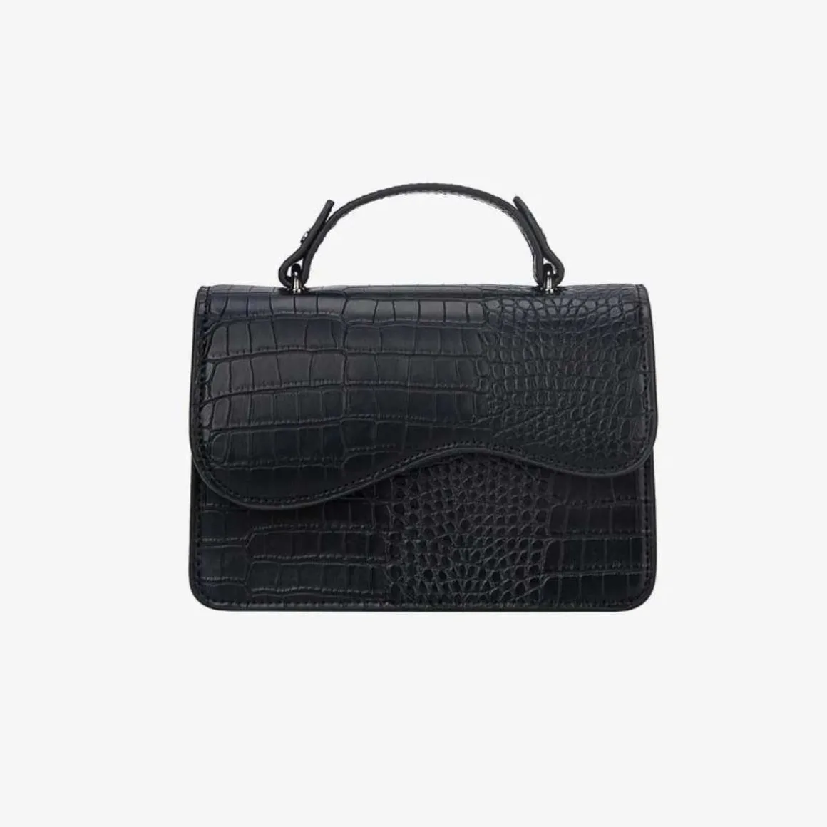 Minibag med bølgete designdetaljer. Vesken har magnetisk lukking og inneholder ett rom med en indre glidelåslomme. Vesken har et kort håndtak og en justerbar crossbody-stropp.