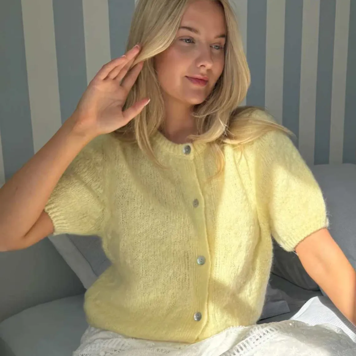 Fuzzy mohair cardigan med lange voluminøse korte ermer, ribbedetaljer og perlemorlook på knappene.