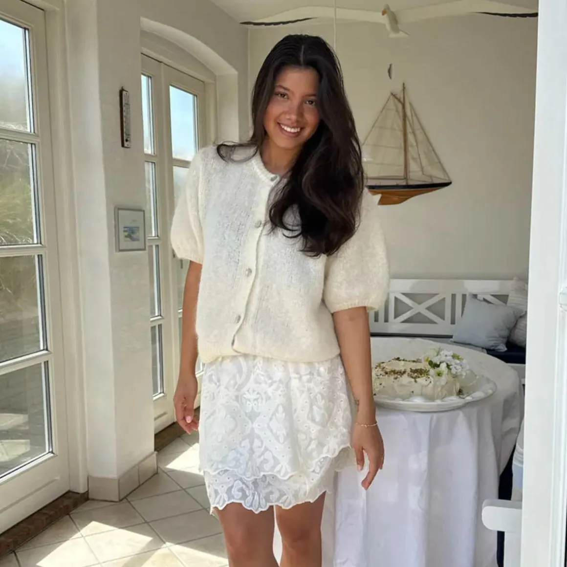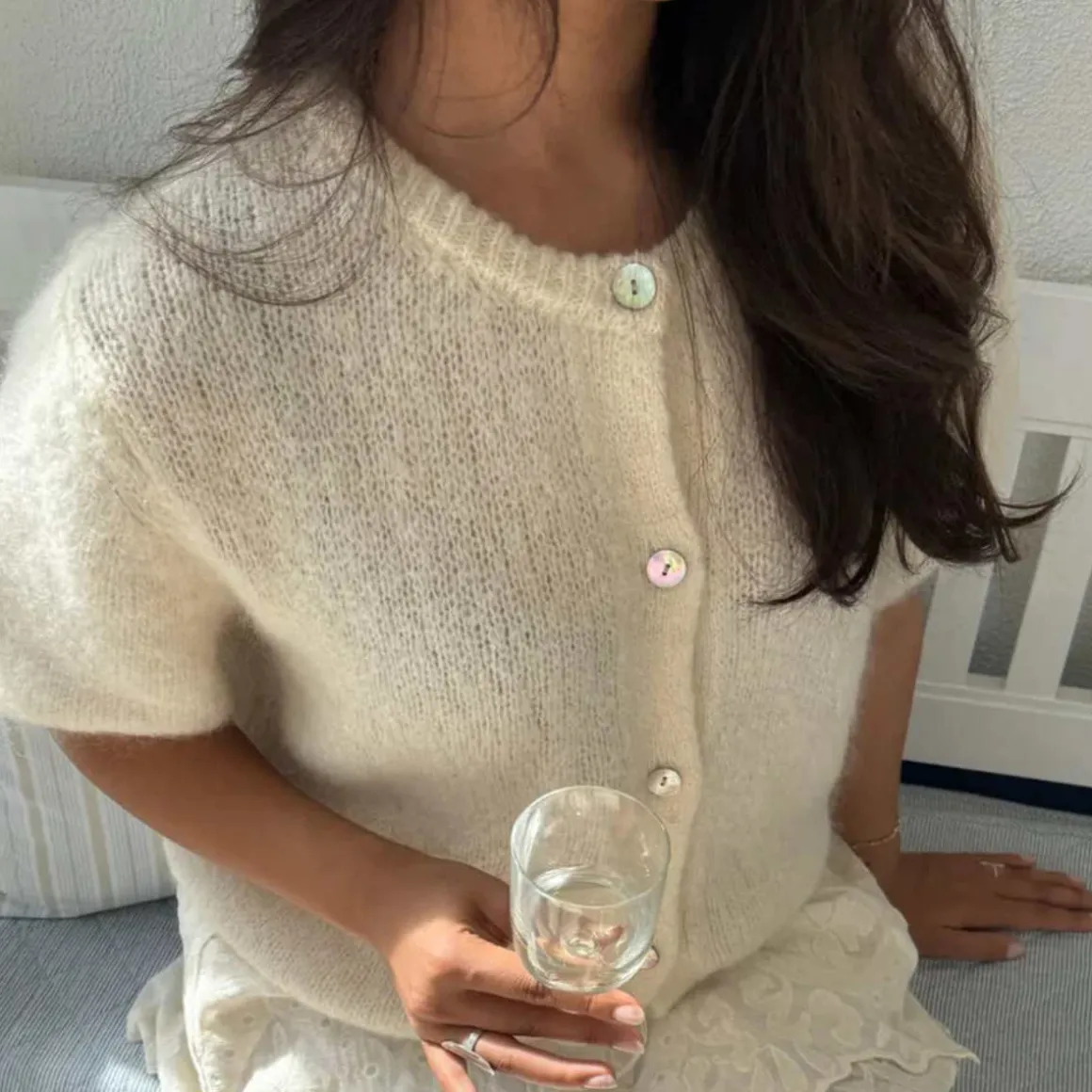 Fuzzy mohair cardigan med lange voluminøse korte ermer, ribbedetaljer og perlemorlook på knappene.