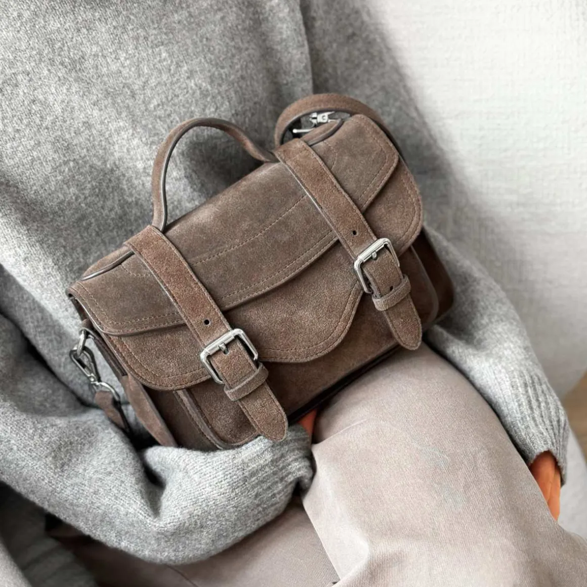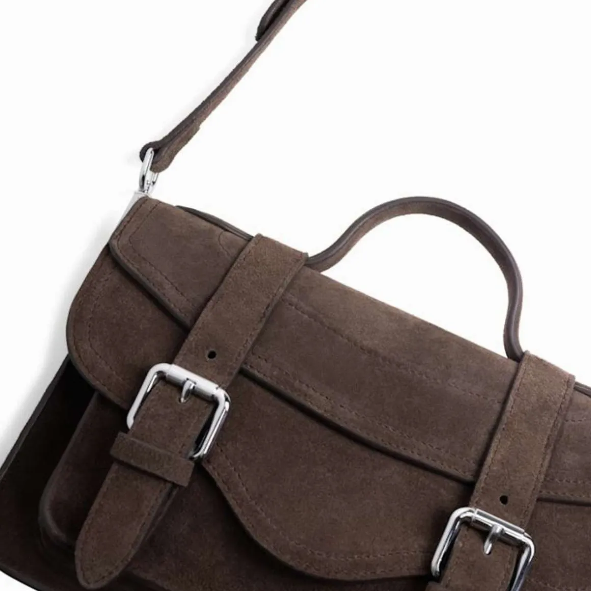 En stilig satchel fra Jim Rickey med markante beltedetaljer, myke linjer og et lokk som enkelt åpnes med trykknapper. Vesken har smarte rominndelinger, et topphåndtak og en justerbar skulderrem for allsidig bæring. Leveres med en beskyttende tøypose.