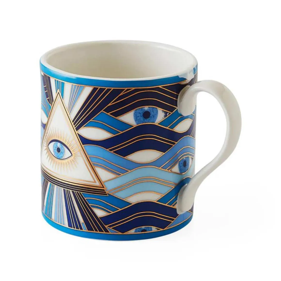Lekkert krus fra Jonathan Adler i blåtoner og gull laget i høybrent porselen.