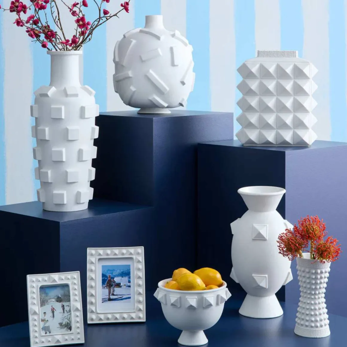 Charade-kolleksjon fra Jonathan Adler kombinerer edgy og elegant på samme tid, med glamorøse og nøye utskårne detaljer støpt i porselen av høyeste kvalitet. Denne vasen har en myk silhuett med grafiske dimensjoner som skaper et spennende uttrykk.