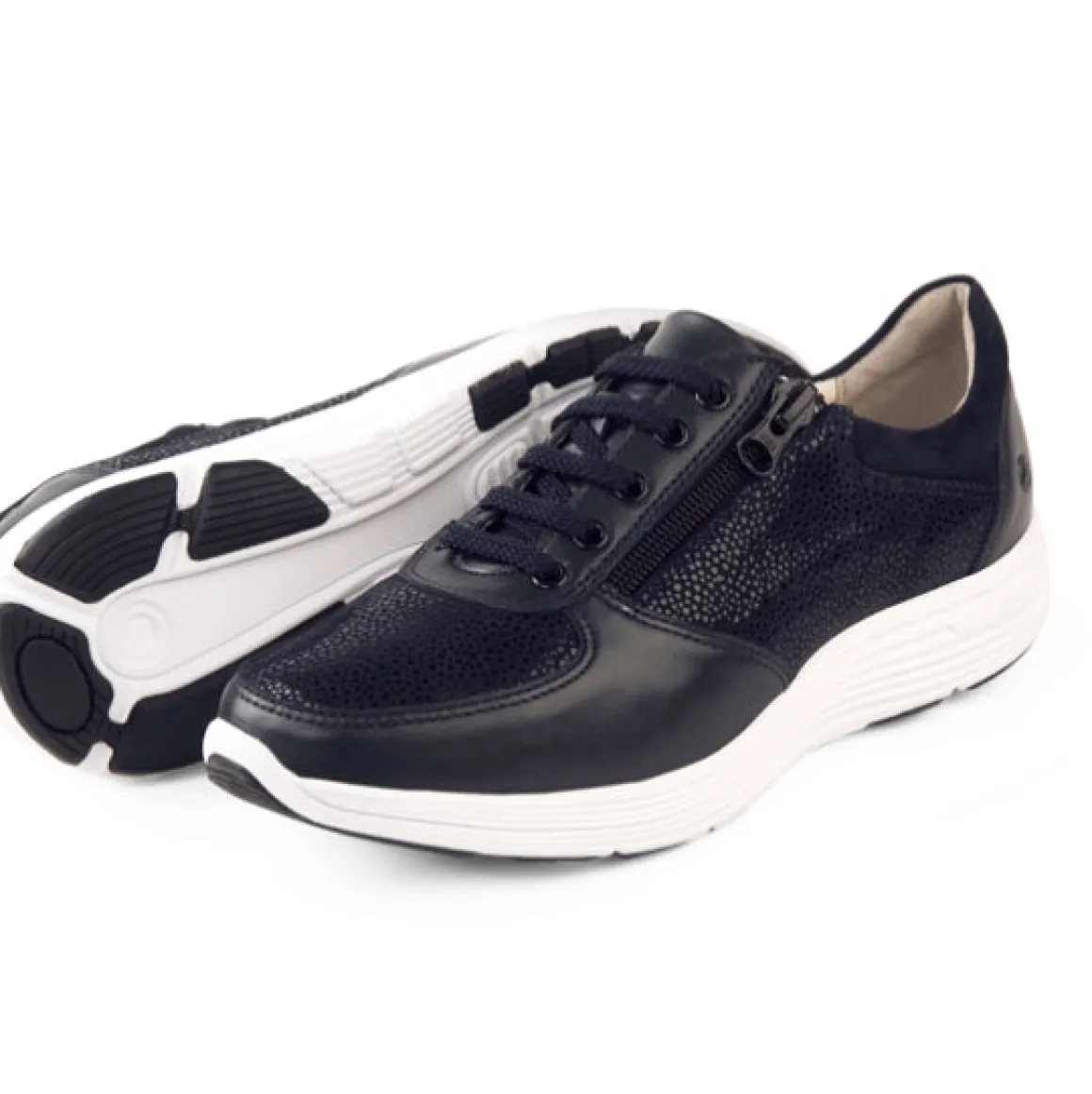 En av Klaveness siste utviklinger: en sporty joggesko med en trendy blanding av kombinasjon av lær på overdelen og skinnfôr med god pusteevne. Perfekt for et avslappet, aktivt utseende, og denne snørestilen har også glidelås langs siden for enkel å ta på og av.