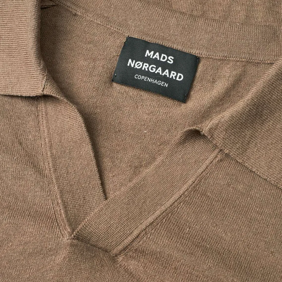 Kortermet poloskjorte fra Mads Nørgaard med et rent og enkelt uttrykk. Modellen har en åpen V-splitt i halsen, ribbestrikkede mansjetter og kant nederst, samt en liten ton-i-ton-brodering nederst. Passformen er rett og avslappet, med glatte flater og en nøytral, ensfarget finish.