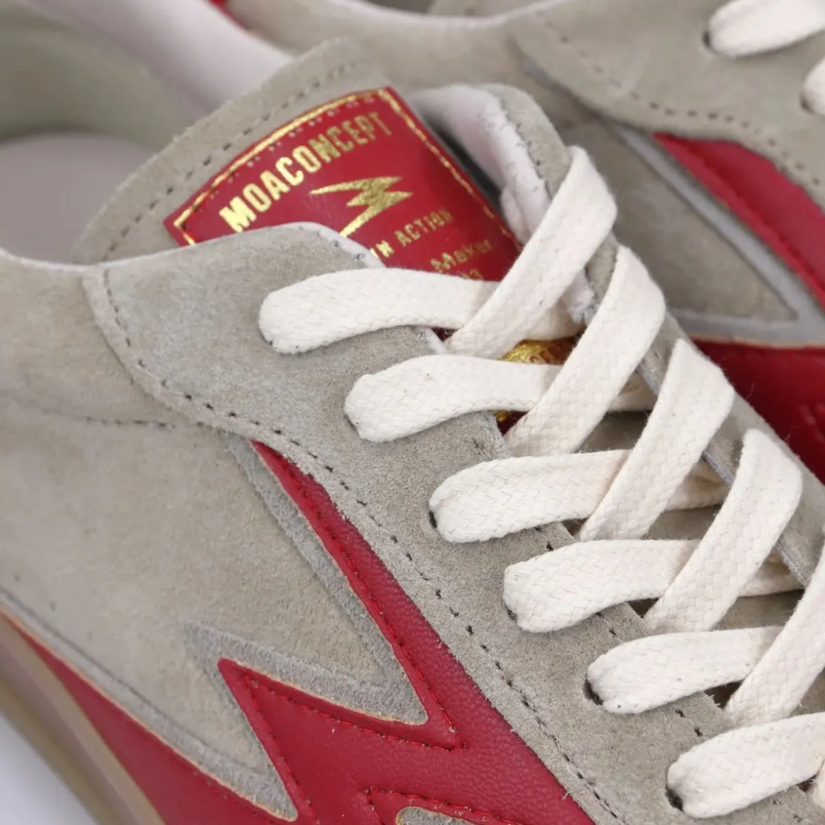 Den honningfargede gummisålen gir et stilrent preg og god komfort, med en sålehøyde på 3,4 cm. Hvite bomullslisser, tunge i matchende semsket skinn samt rød skinnlogo og backtab i rødt skinn gir gjennomførte detaljer.