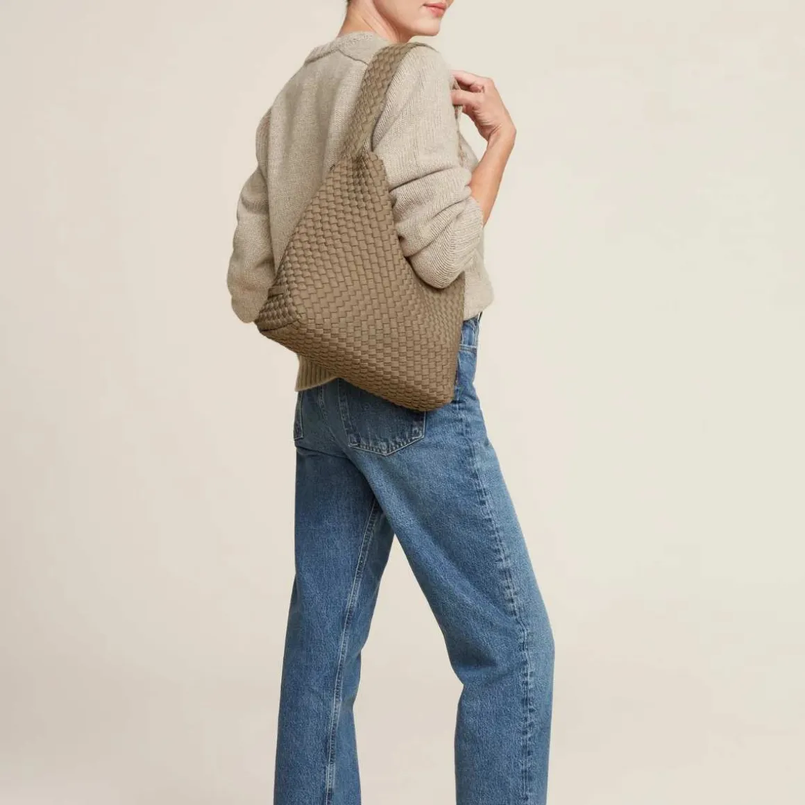 Håndvevd neopren veske fra Naghedi i Cashmere. Nomad Hobo er romslig og behagelig å ha på seg hele dagen, med en bred stropp som sitter flatt på skulderen.
