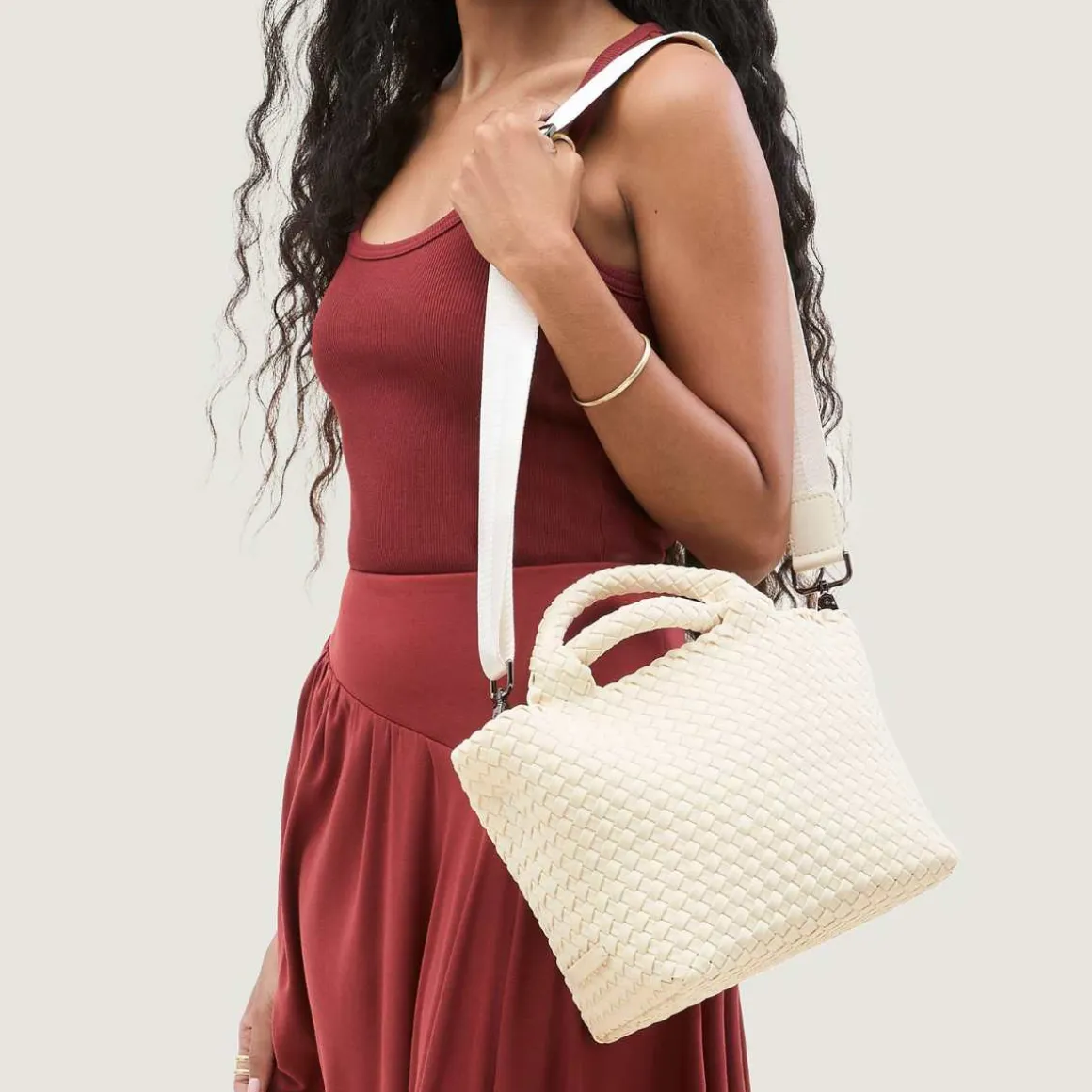 St Barths Tote Bag i small fra Naghedi. Håndvevd neopren i salt. St. Barths Small Tote er perfekt å ha med seg hele dagen, og er vesken du vil gripe etter hver morgen.