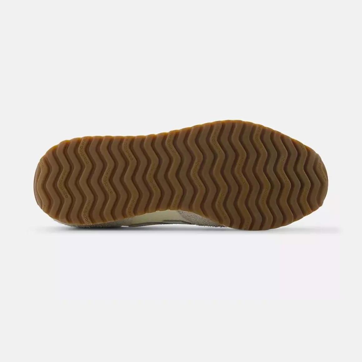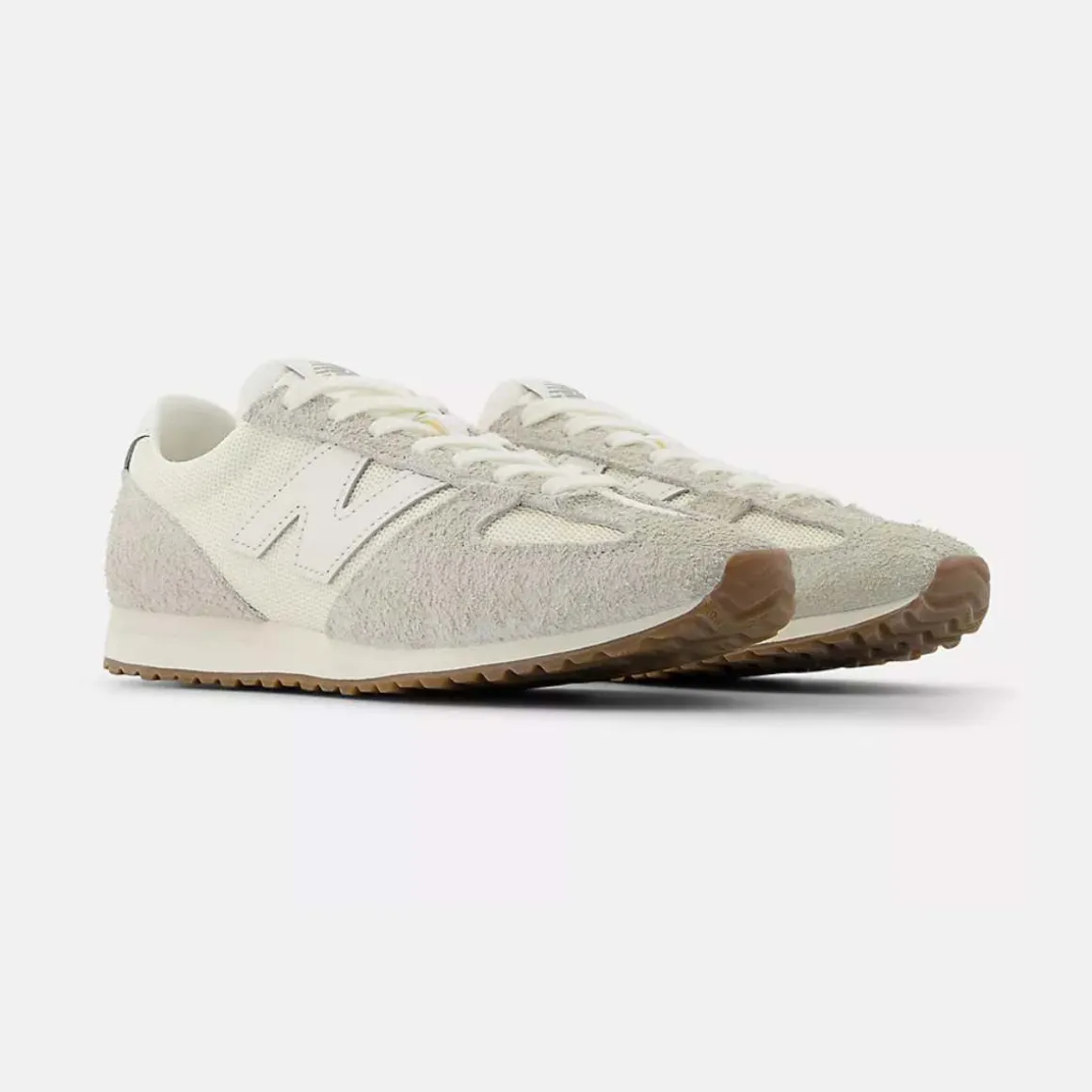 Overdelen består av pustende mesh med hårete semskede skinnoverlag, som gir både tekstur og et avslappet, vintageinspirert uttrykk. Den karakteristiske “fang”-detaljen ved tåpartiet, inspirert av designet fra den originale New Balance 320, gir modellen et unikt og gjenkjennelig preg. Skinnlogoer og detaljer ved krage og hæl fullfører designet.