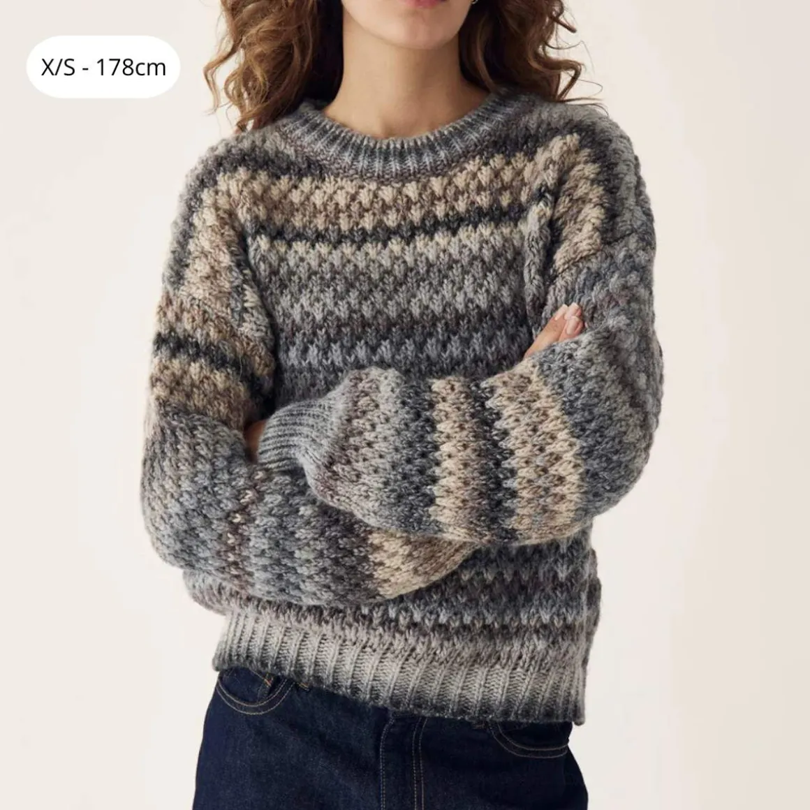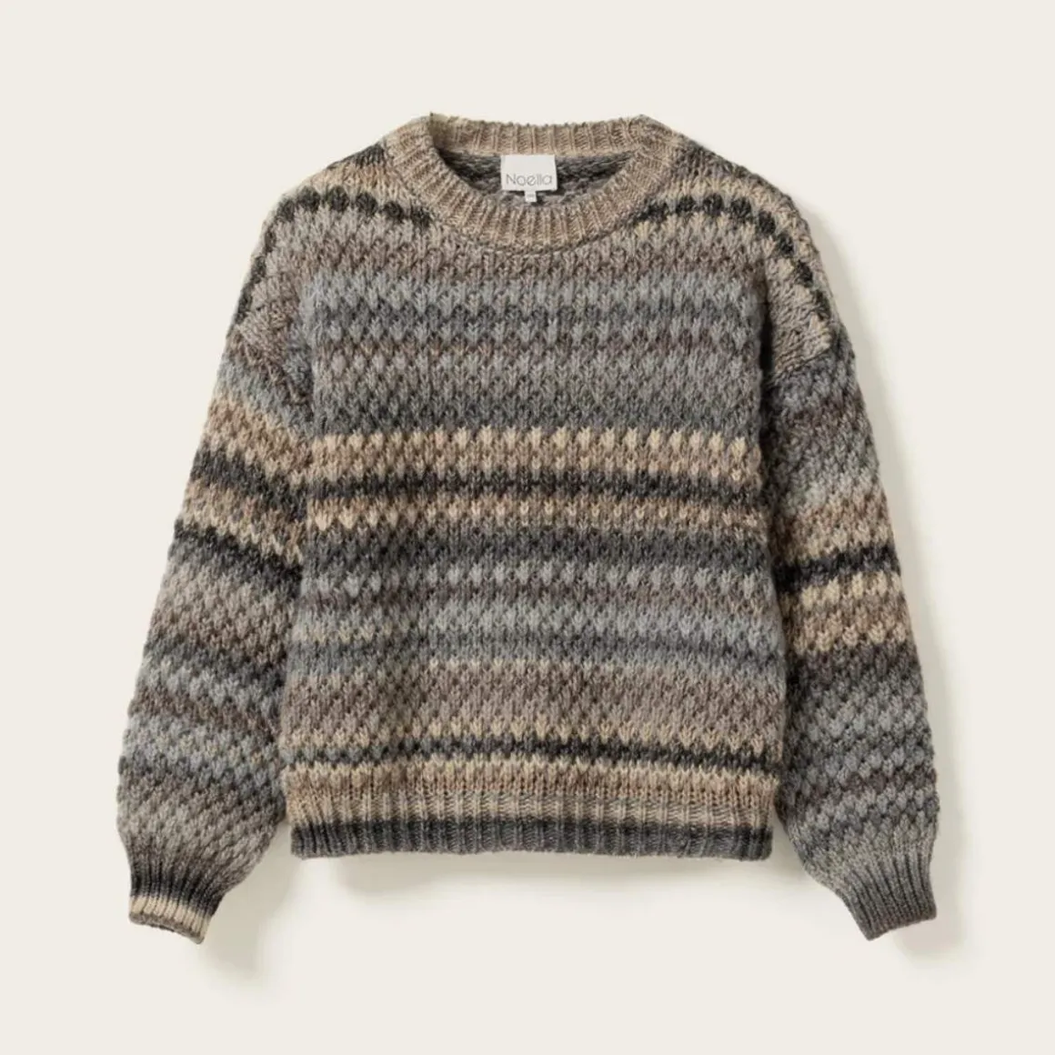 Gio Knit Sweater er en løs genser laget av 53 ull. Hvert plagg er unikt på grunn av garnets fargeprosess, noe som kan gi små variasjoner mellom produktene. Den har ballongermer.
