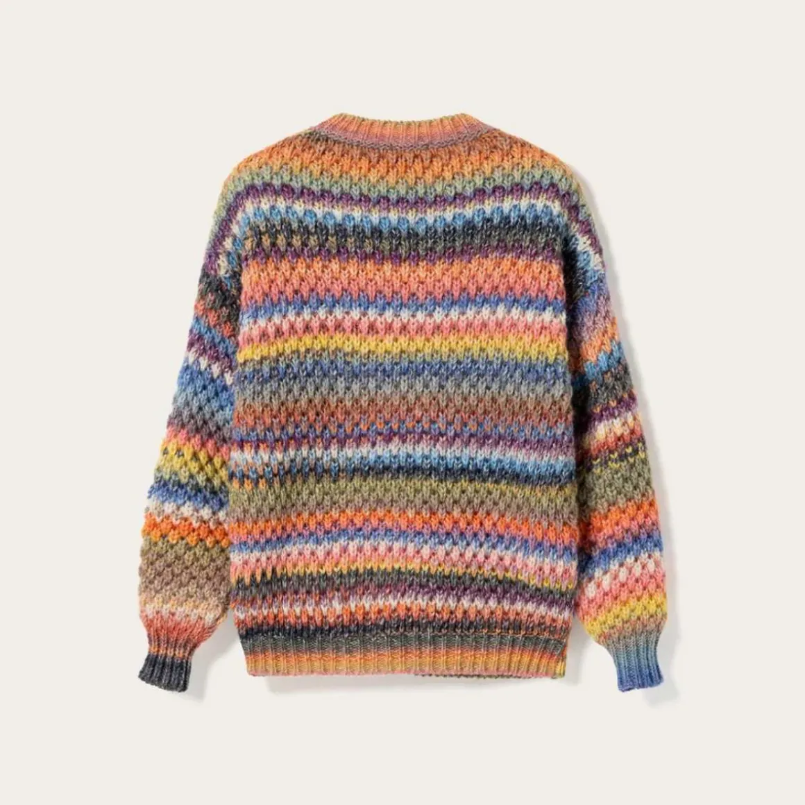 Gio Knit Sweater er en løs genser laget av 53 ull. Hvert plagg er unikt på grunn av garnets fargeprosess, noe som kan gi små variasjoner mellom produktene. Den har ballongermer.