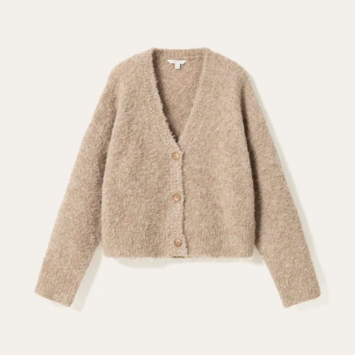 N-Mertis Knit fra Noella er en løs, strikket cardigan i bouclé-garn med lange ermer og V-hals for et avslappet, men elegant uttrykk.