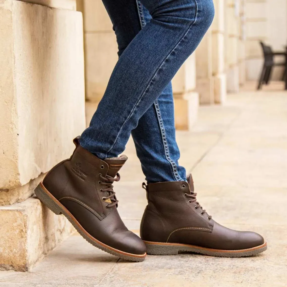 Ankelboots i skinn med fôr av saueskinn fra Panama Jack. Glasgow kombinerer stil med kvalitet for å holde føttene gode og varme i vinterens kulde. Vanntett og pustende – perfekt til norske forhold.