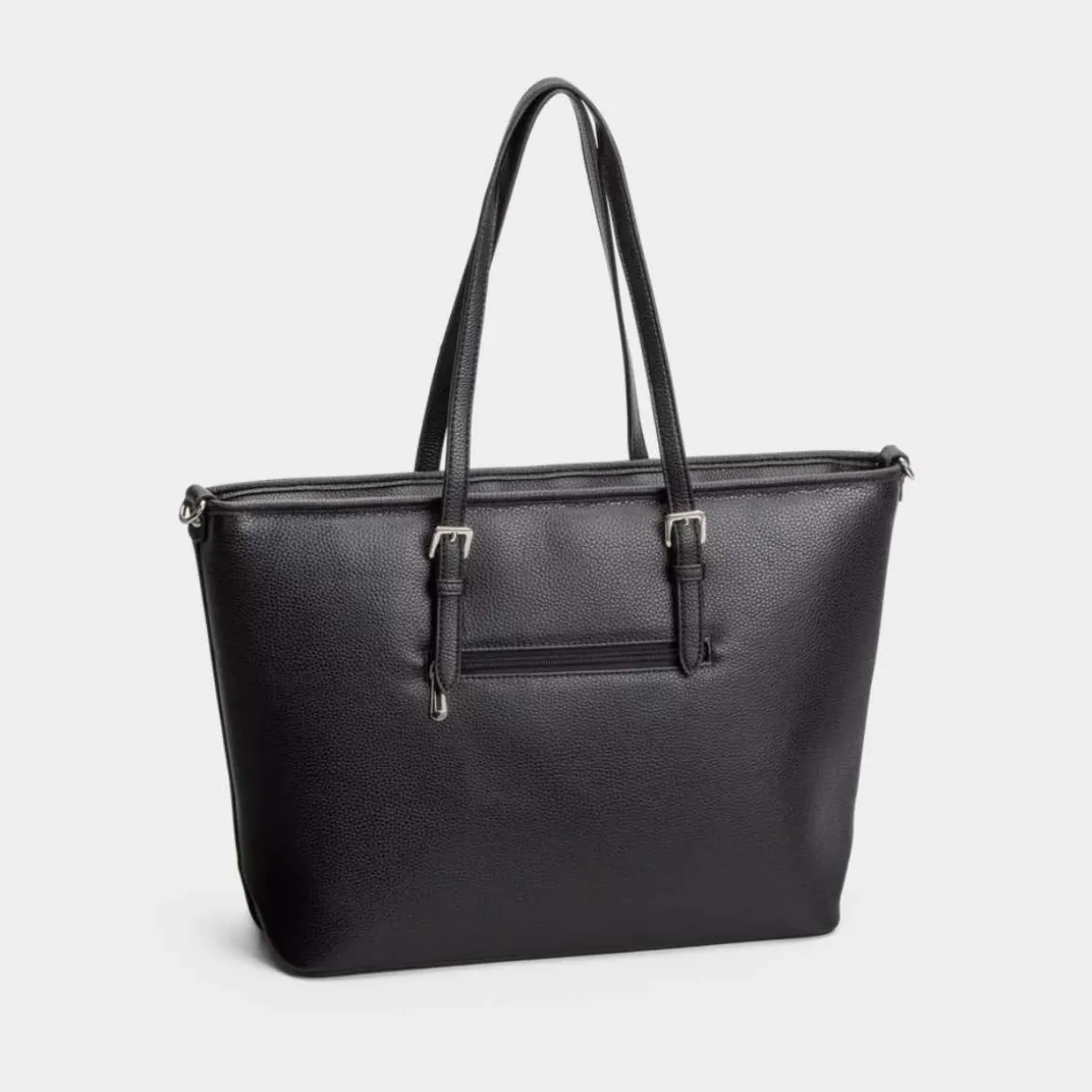 Klassisk sort veske fra Puccini, laget av nydelig imitert skinn. Vesken er designet med en stabil bunn utrustet med metallføtter, noe som gjør det enkelt å plassere den hvor som helst uten bekymringer. Den praktiske toppglidelåsen sikrer dine eiendeler trygt på plass. På innsiden finner du to store åpne rom, to mindre åpne lommer og to glidelåslommer, perfekt for organisering av dine nødvendigheter.