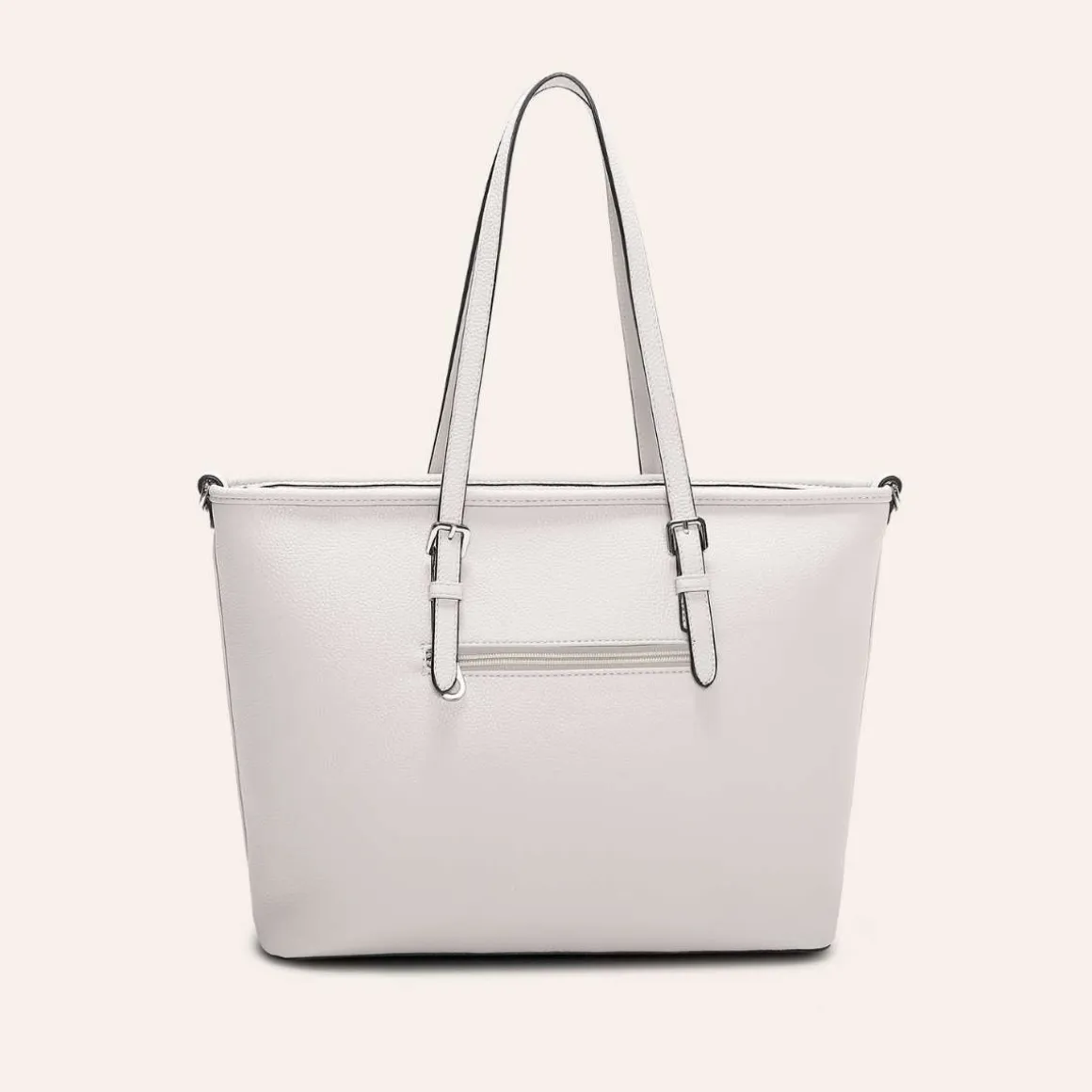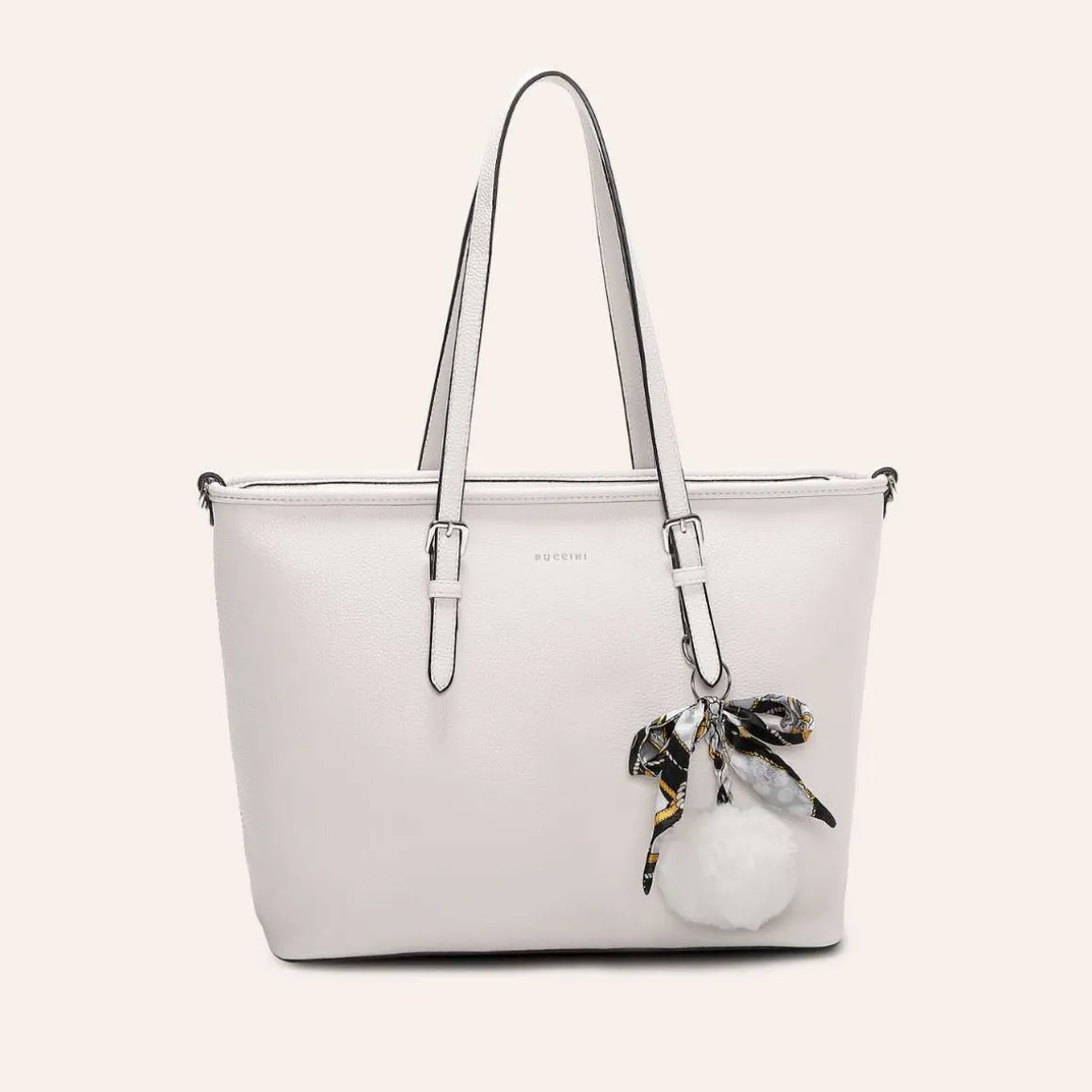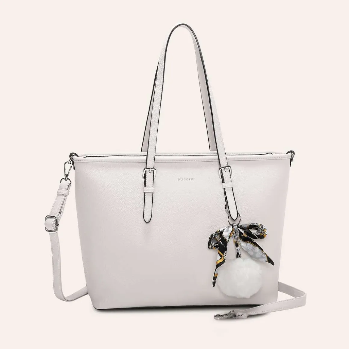 Klassisk beige veske fra Puccini, laget av nydelig imitert skinn. Vesken er designet med en stabil bunn utrustet med metallføtter, noe som gjør det enkelt å plassere den hvor som helst uten bekymringer. Den praktiske toppglidelåsen sikrer dine eiendeler trygt på plass. På innsiden finner du to store åpne rom, to mindre åpne lommer og to glidelåslommer, perfekt for organisering av dine nødvendigheter.