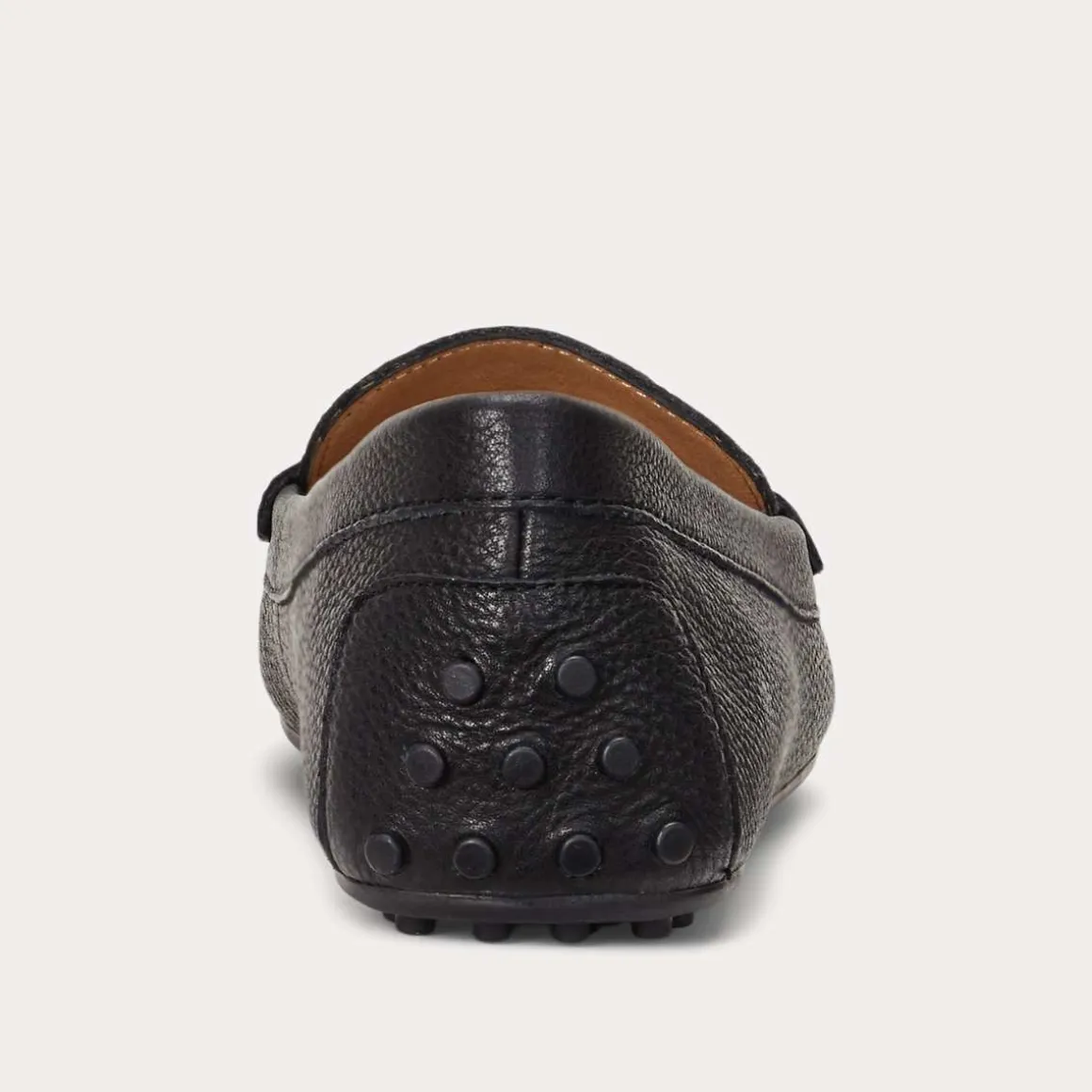 Moderne loafer fra Ralph Lauren til dame i luksuriøst skrapet lær gir en subtil tekstur og har den ikoniske «LRL» metalllogoen på vampsiden, sammen med en eksklusiv gummibøffelsåle for ekstra komfort og holdbarhet.