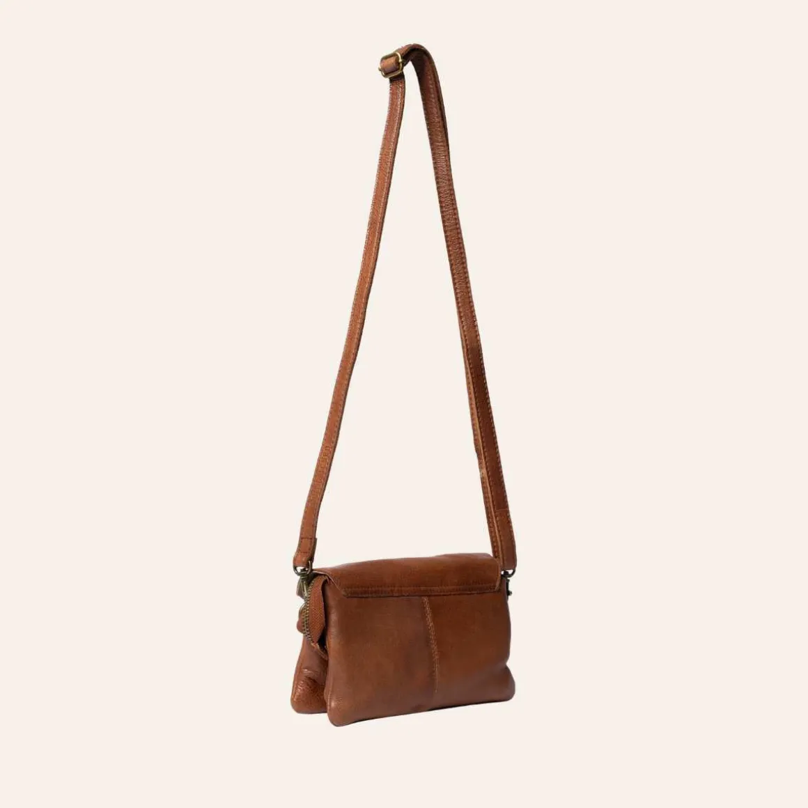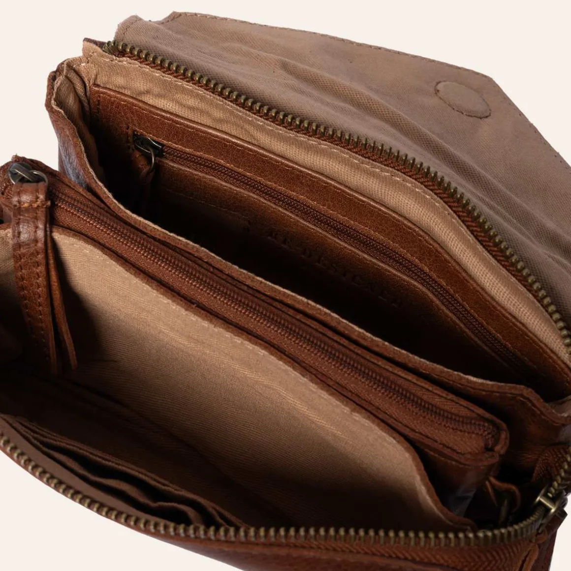 Liten clutch fra Redesigned by Dixie. Vesken lukkes med glidelås og klaff. Vesken er delt inn i et stort rom med to mindre innerlommer for enhver mobil. samt en lomme som lukkes med glidelås.