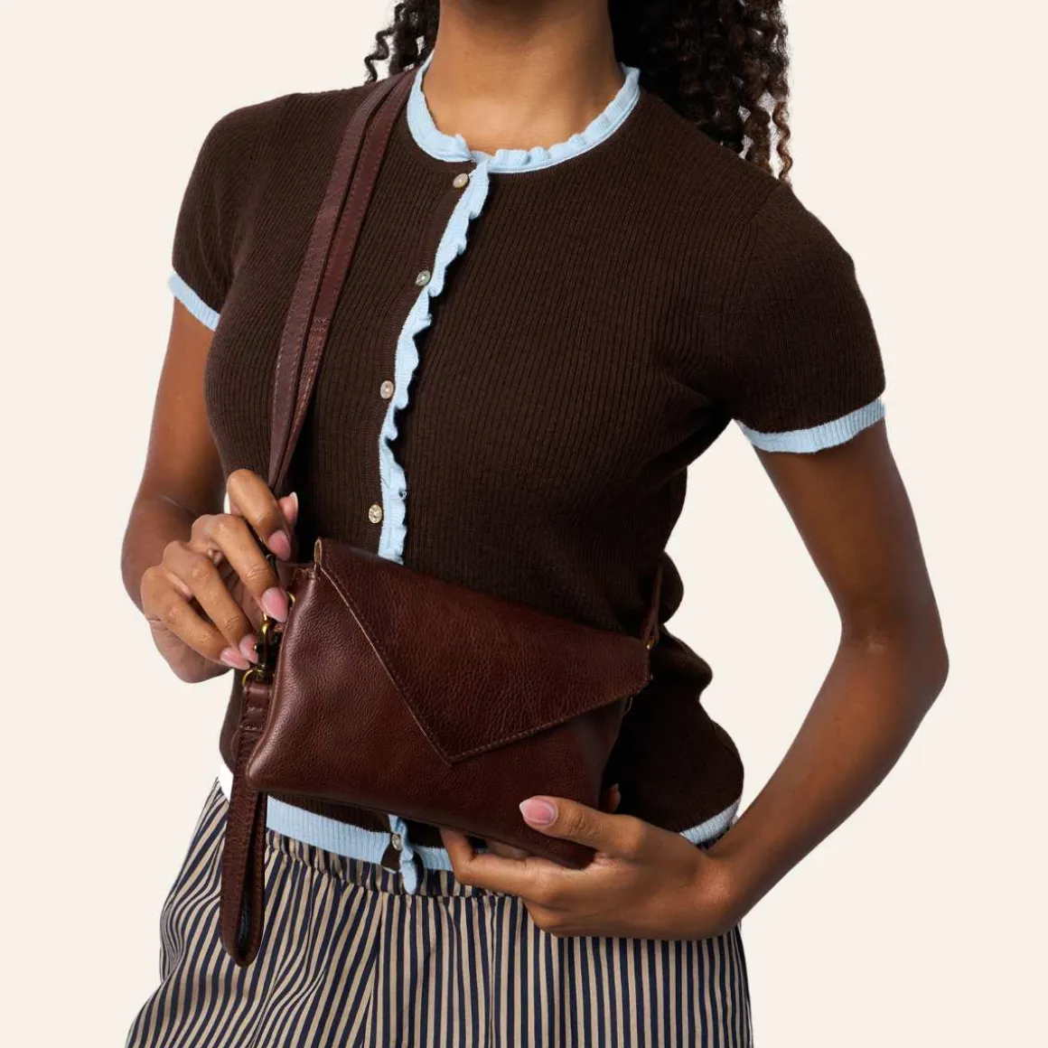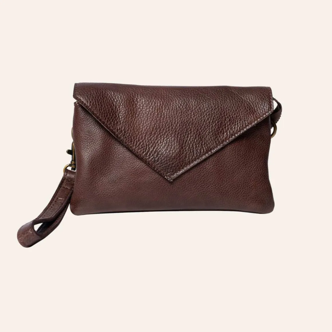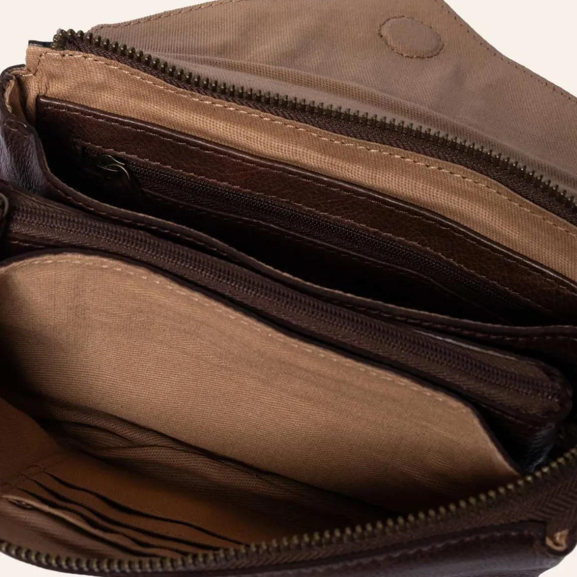 Liten clutch fra Redesigned by Dixie. Vesken lukkes med glidelås og klaff. Vesken er delt inn i et stort rom med to mindre innerlommer for enhver mobil. samt en lomme som lukkes med glidelås.