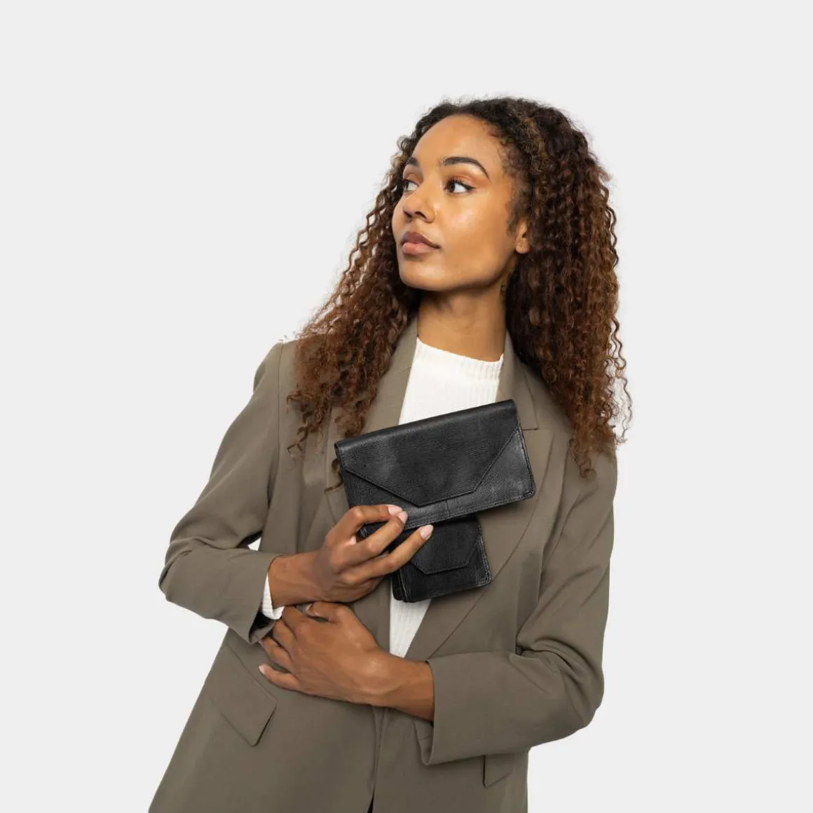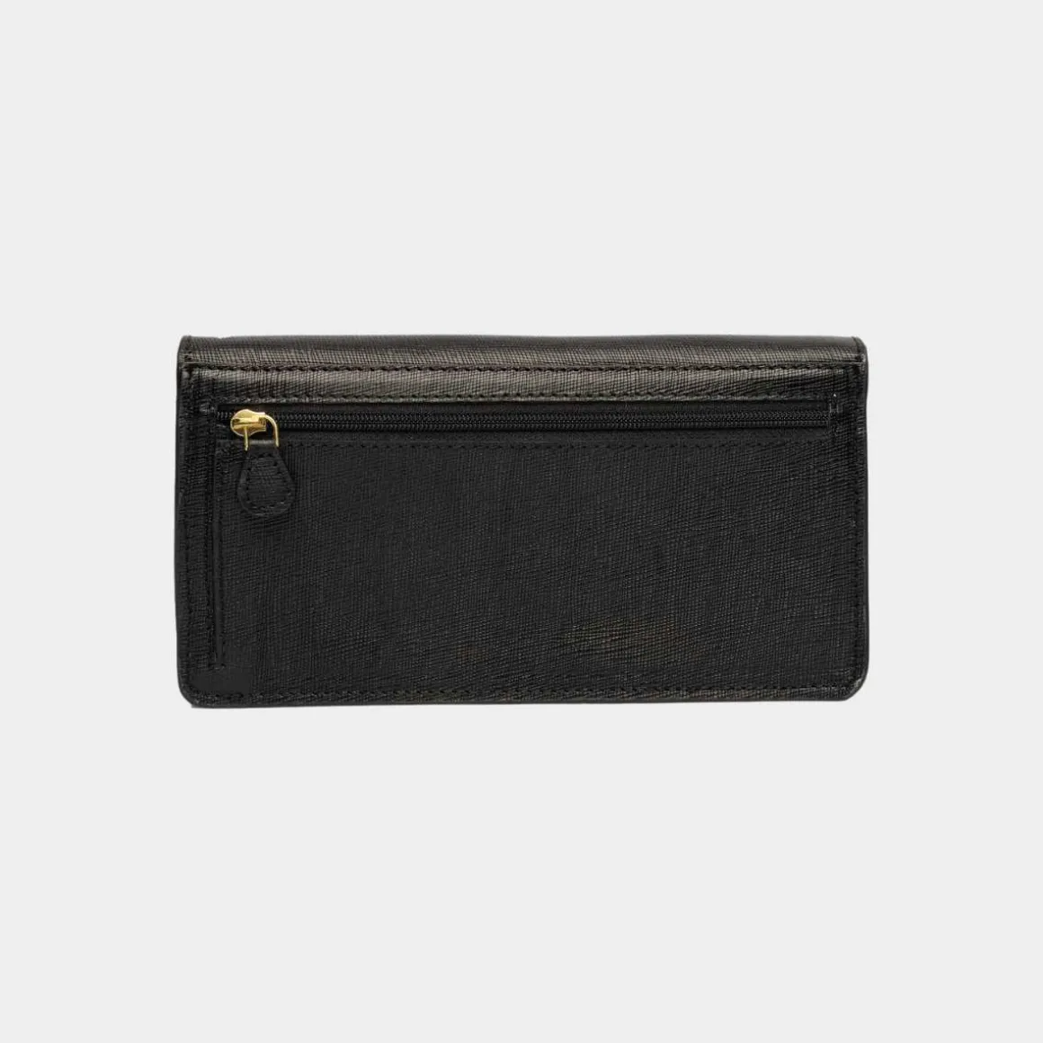 ReDesigned by Dixie, Elvira Wallet i svart. Elvira-lommeboken er laget av det eksklusive Saffiano-læret. Den har to hovedrom, adskilt av et glidelåsrom. På forsiden er det fire lommer for kredittkort. På baksiden er det en liten glidelåslomme. Lommeboken lukkes med en sterk trykknapp. Den er romslig nok til å passe en telefon.