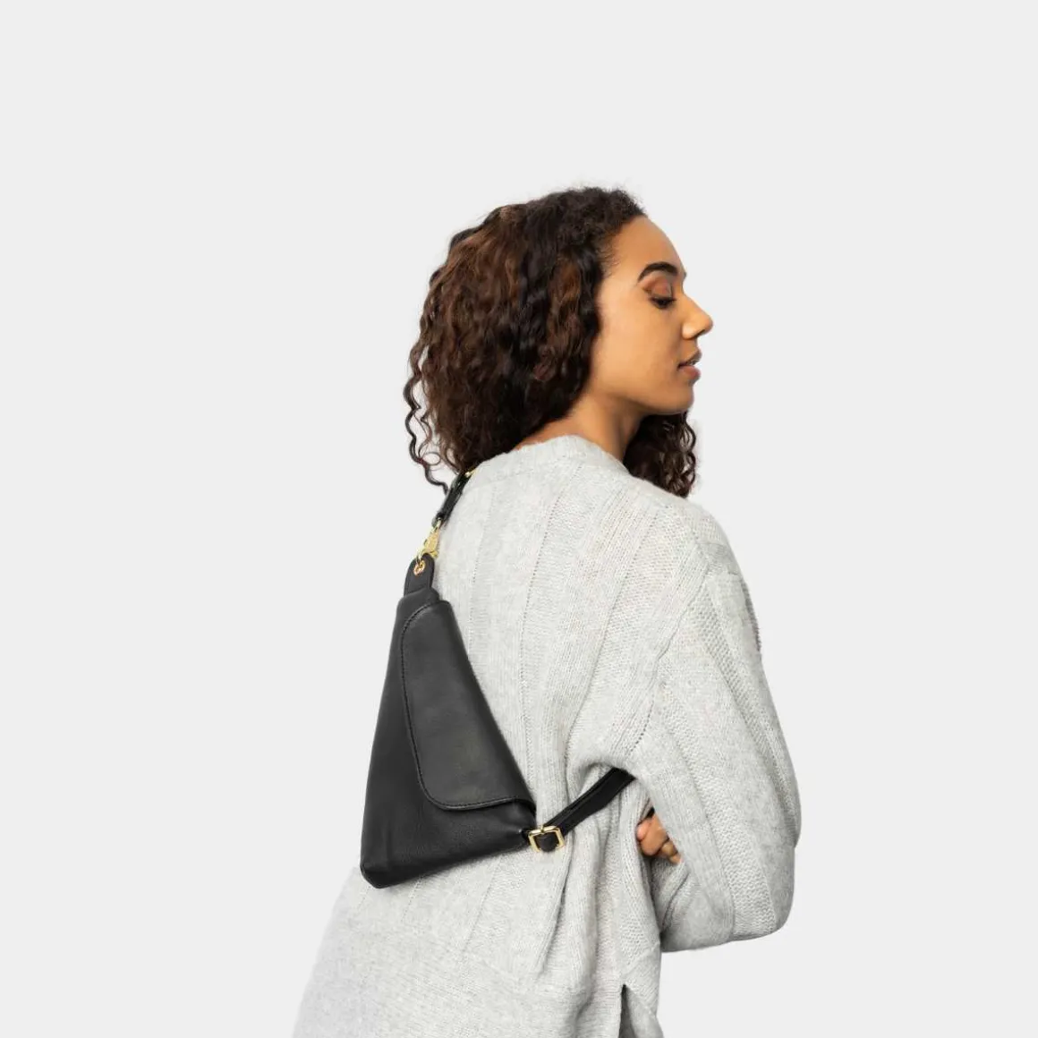 ReDesigned by Dixie, Franka i svart. Vesken er laget av lær, og dens unike trekantede form sammen med klaffelukking gir et moderne uttrykk. Denne vesken kombinerer mote med funksjonalitet, og sikrer at du holder stilen selv når du er på farten.