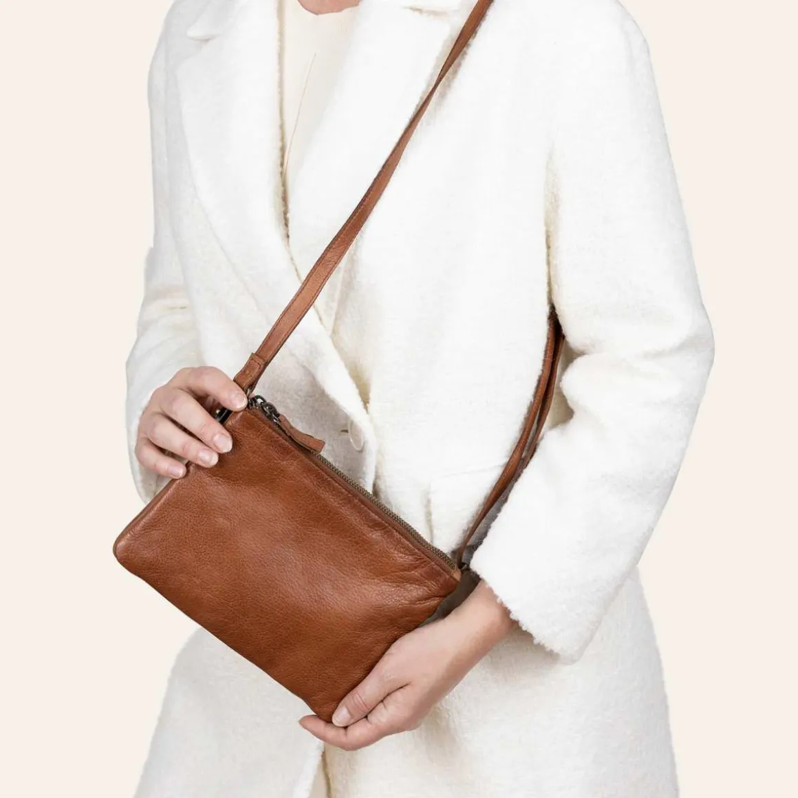 Vesken omsluttes med to glidelåser øverst som fører til to adskilte avdelinger. Ett rom med mindre glidelåslomme og et annet med åpen mobillomme. Den har en avtakbar og justerbar skulderrem i skinn. Bare fest en av stroppene til ringene i begge toppender.
