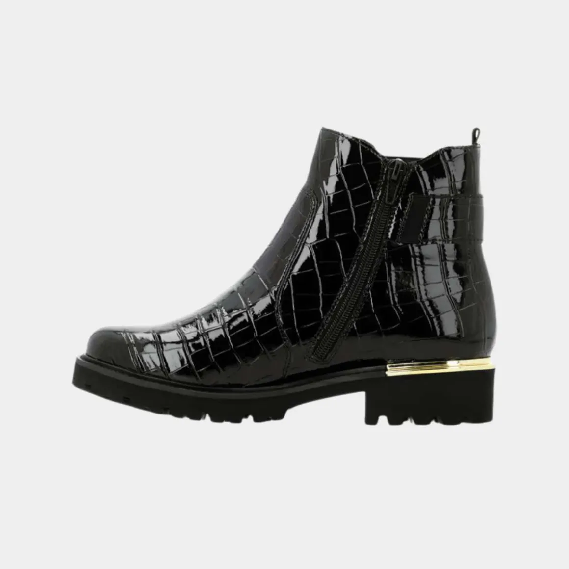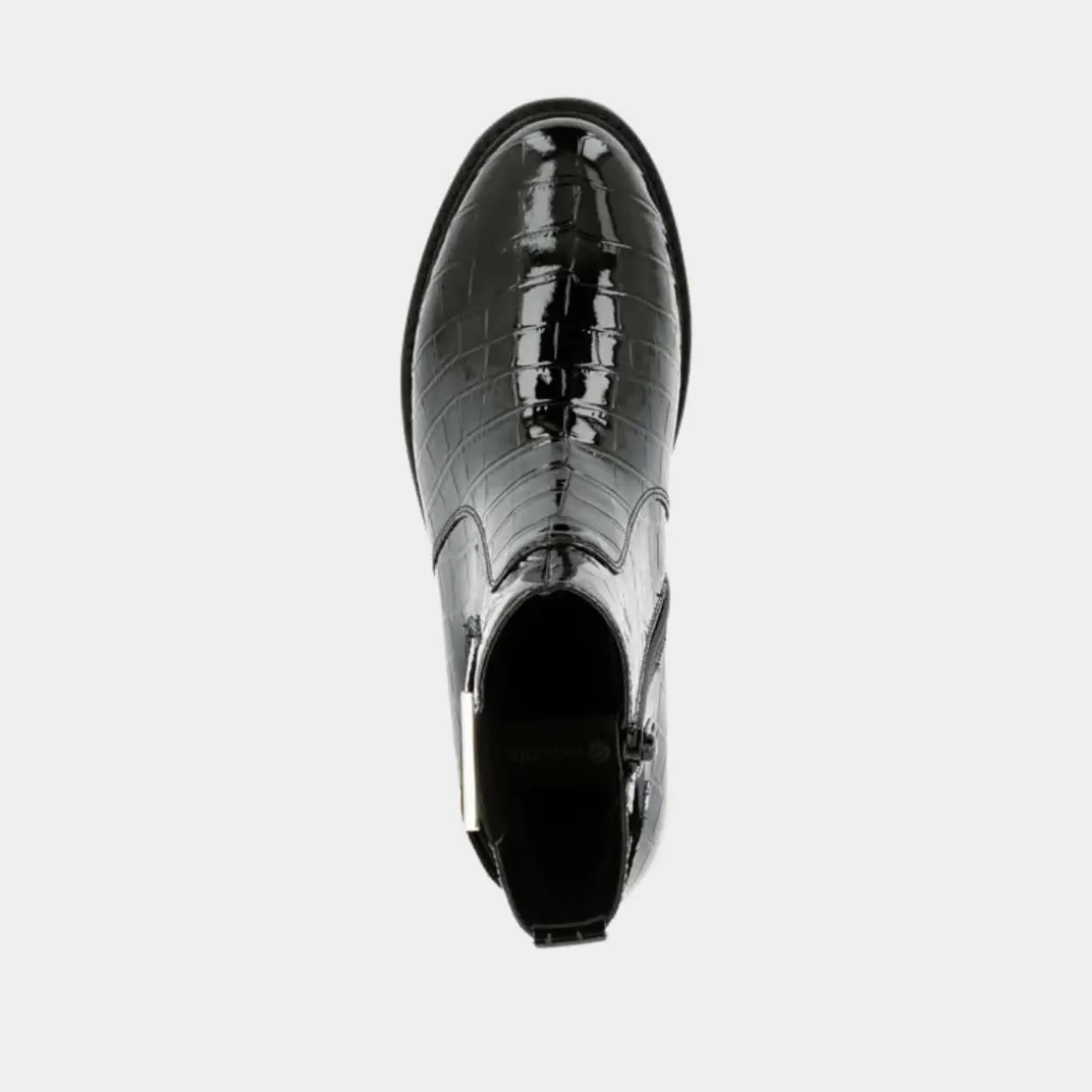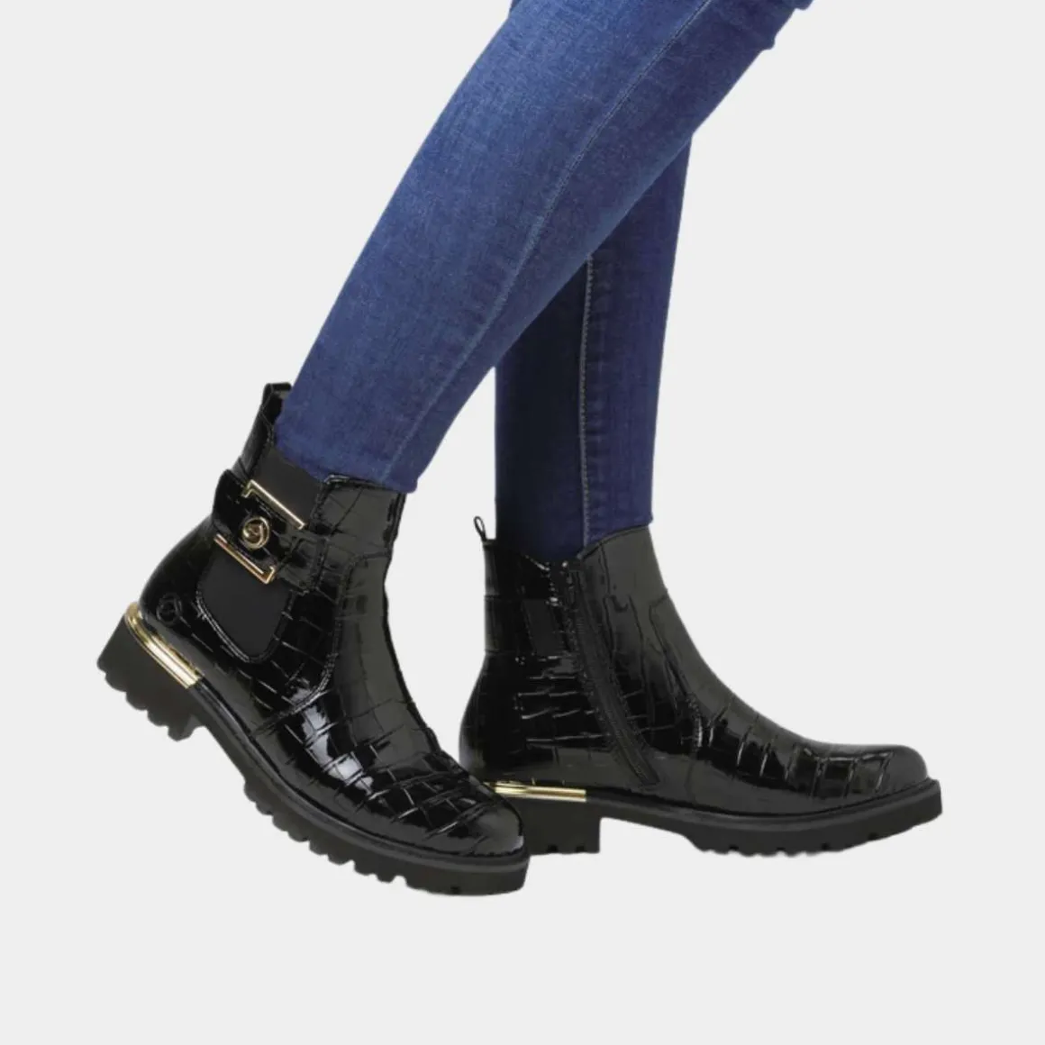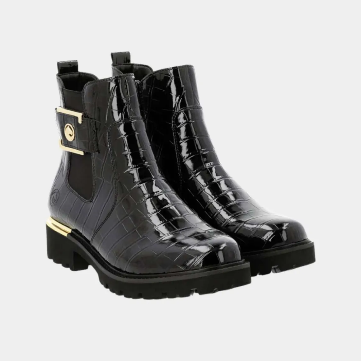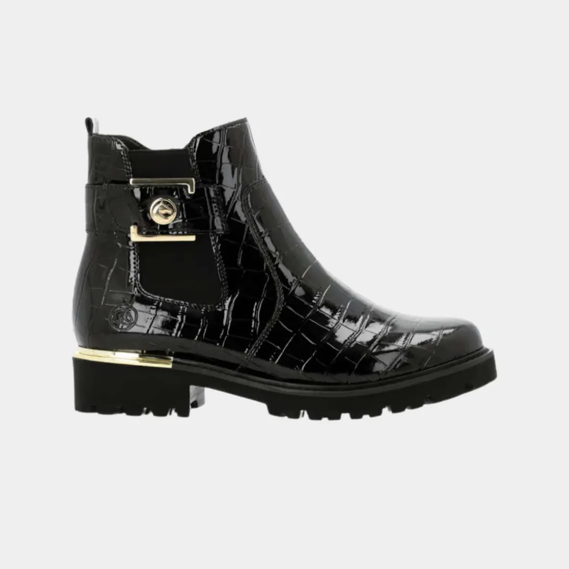 Remonte Chelsea Boots i kunstlakk kombinerer klassisk stil med moderne komfort. Disse svarte bootsene har en EVA-såle, komfortbredde (G – G ½), og en hælhøyde på 39 mm. Den polstrede, utskiftbare innersålen og det myke velurfôret sikrer langvarig komfort. Med glidelås og elastisk panel er de enkle å ta av og på, mens det gyldne smykkeelementet på siden gir en elegant touch.